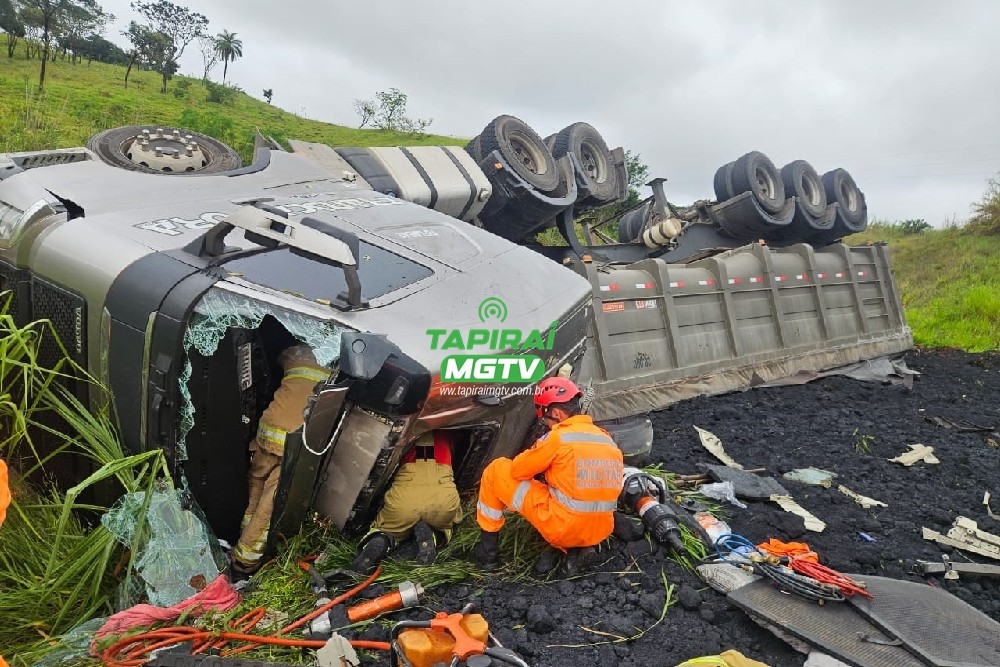Vídeo: Motorista fica com braço preso após tombamento de carreta na LMG-824, em Doresópolis
