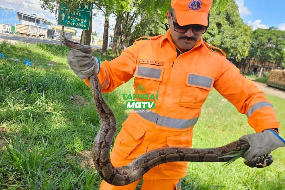 Corpo de Bombeiros realiza captura de jiboia às margens da BR-354, em Arcos