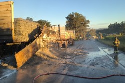 Vídeo: Carreta carregada com cimento pega fogo e mobiliza bombeiros na BR-354