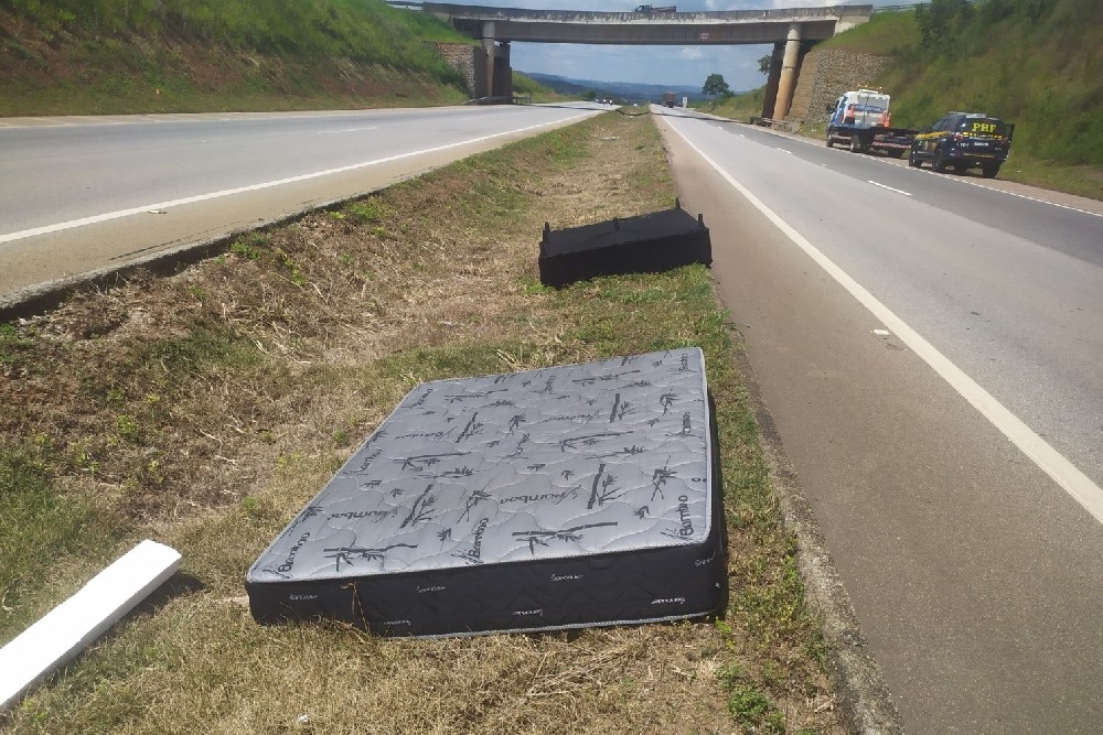 Cama cai de caminhonete transportada por reboque e causa acidente na BR-262