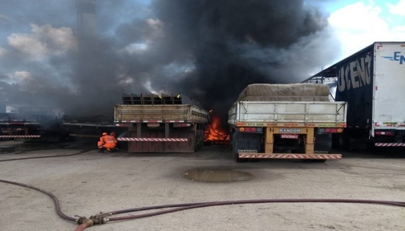 Os veículos estavam no pátio de uma transportadora. O Corpo de Bombeiros foi chamado para controlar as chamas.