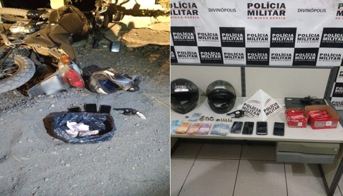 Os militares conseguiram abordar os suspeitos. No local, foram localizados um notebook, duas caixas de chocolate, celulares das vítimas juntamente com o dinheiro roubado na pizzaria (R$413,90), a motocicleta roubada no local do assalto bem como os capacetes que também foram roubados, e a arma utilizada no roubo.
