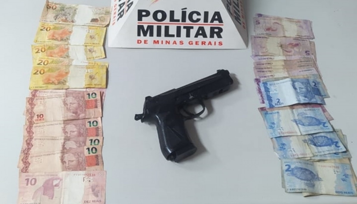 As guarnições que estavam de serviço compareceram rapidamente ao local e realizaram a apreensão de uma Réplica de arma de fogo utilizada pelo infrator, uma motocicleta HONDA/CG sem placa que foi utilizada para cometer o delito e a quantia de R$291,00 que foi subtraída das vítimas.