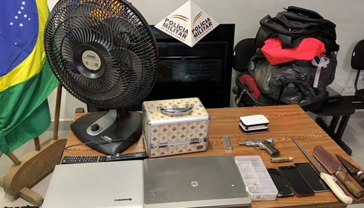 A polícia também informou que ele estava com uma pistola calibre .765 com três munições. No veículo foram localizados três televisões, dois notebooks, roupas, joias, cheques e diversos outros bens roubados da vítima.