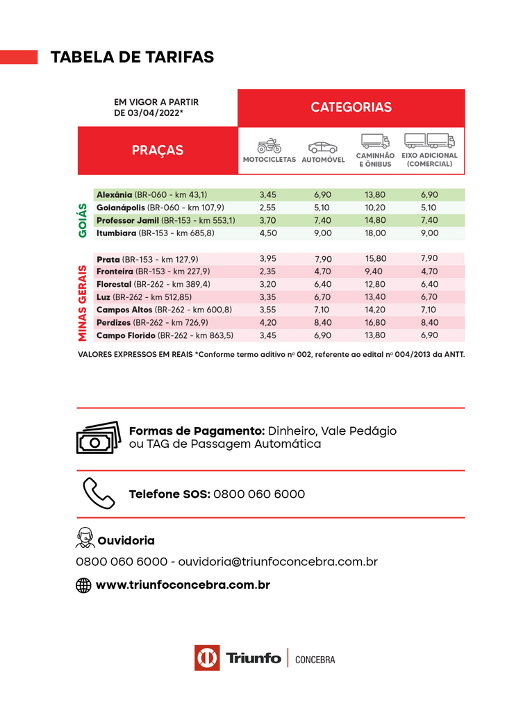 Os novos valores para o trecho do pedágio de Luz são R$ 6,70 para automóveis, R$ 3,35 para motocicletas, R$ 12,40 para caminhões e ônibus e R$ 6,70 para eixo adicional.