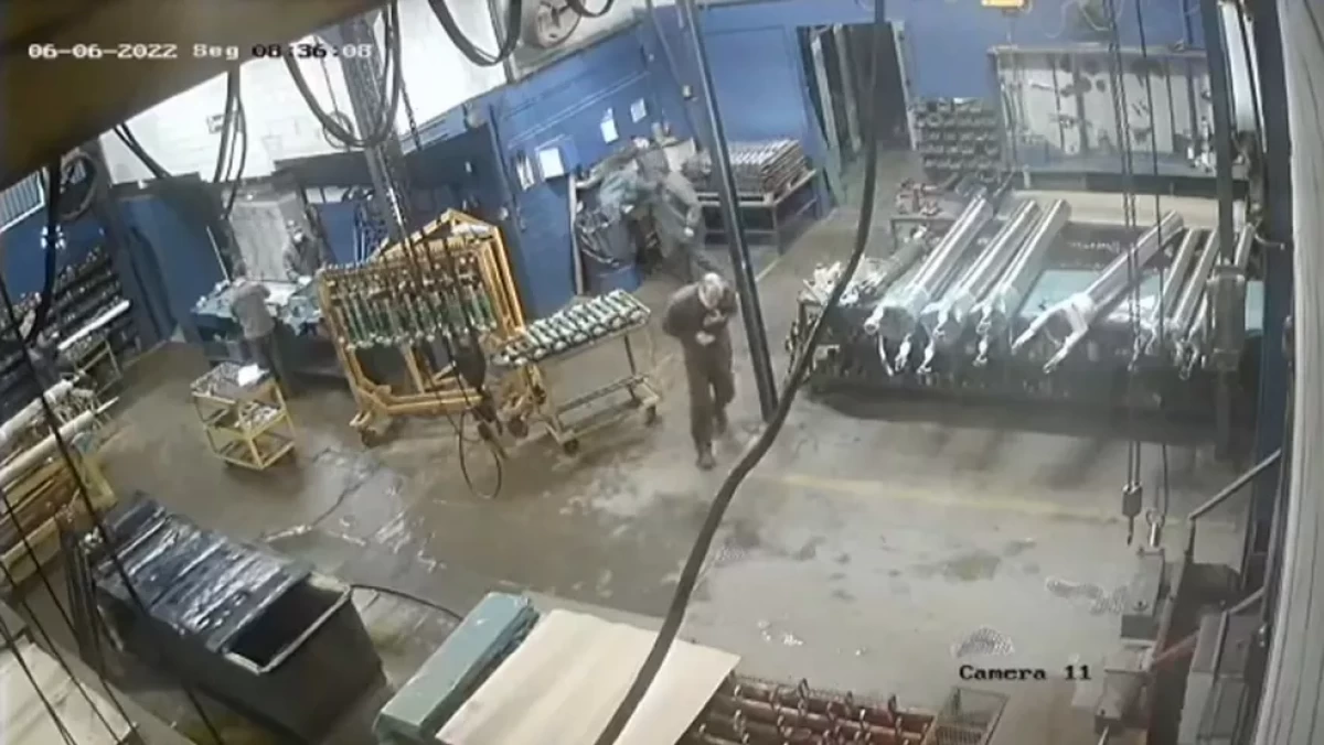 Imagens da câmera de segurança da empresa mostram a vítima saindo de uma sala com a mão no peito e cambaleando. Ele passou por um setor em que outros funcionários estavam trabalhando e saiu outra porta.