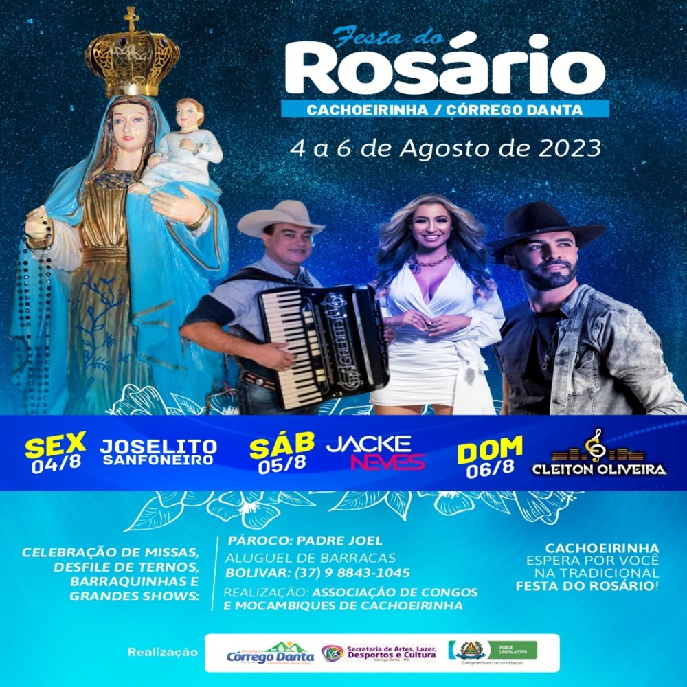 A tradicional Festa de Nossa Senhora do Rosário de Cachoeirinha acontece nos dias 04, 05 e 06 de agosto.