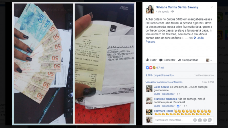 Depois de fazer o pagamento, Silviane publicou a história nas redes sociais, para tentar localizar a dona do dinheiro. A publicação, ao contrário do que ela esperava, ganhou repercussão e, até as 21h desta segunda-feira (7), já teve mais de 9 mil compartilhamentos e 7 mil reações.