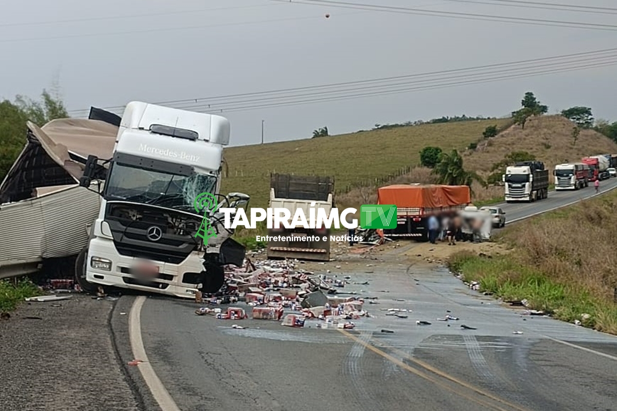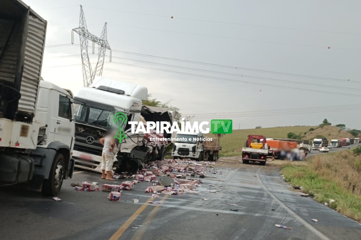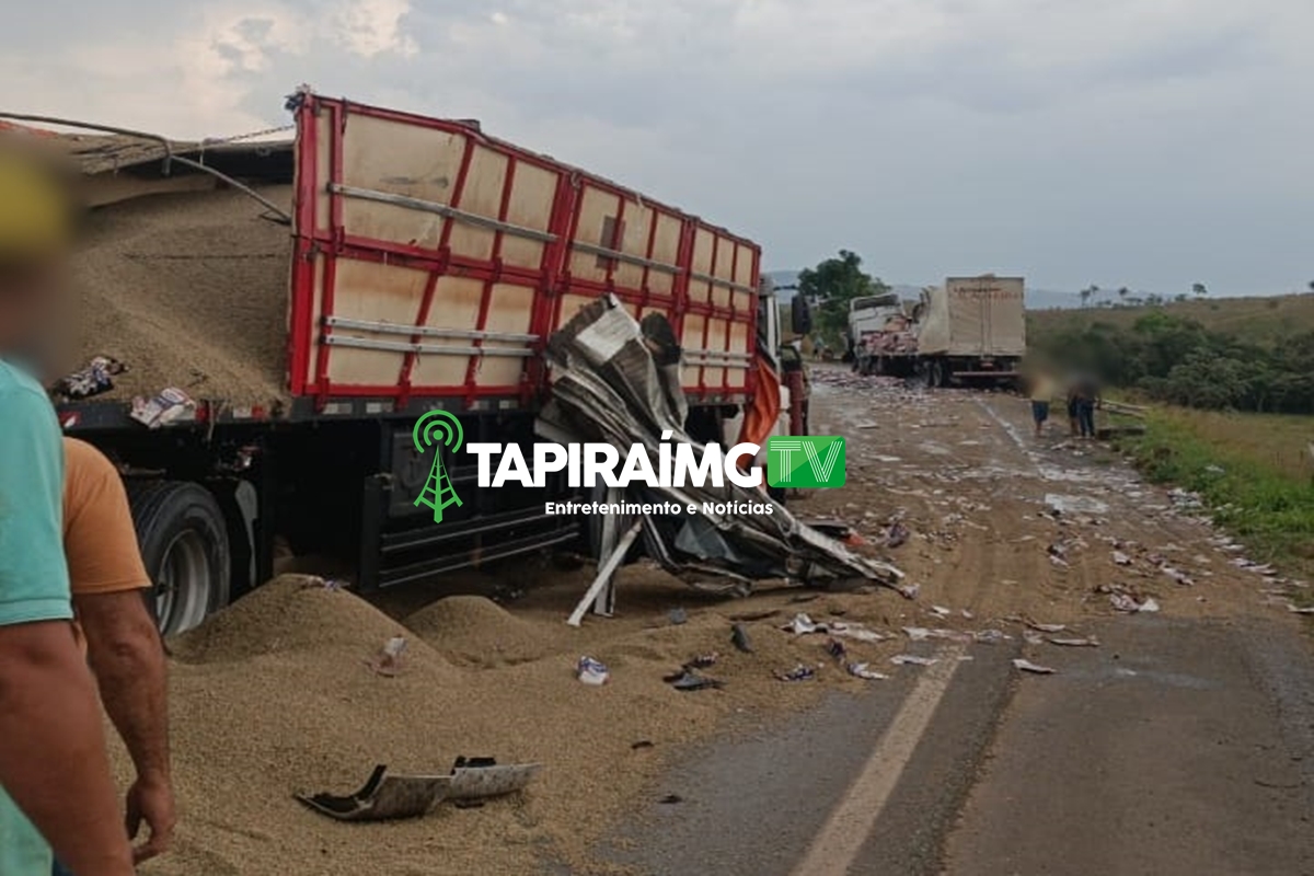 De acordo com informações apuradas pelo Tapiraímg TV, no local, houve uma colisão envolvendo uma carreta que transportava café em grãos e uma carreta carregada com caixas de leite.