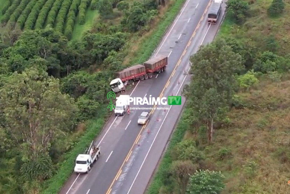 Imagens capturadas por um drone, mostram a carreta parcialmente fora da pista. O trânsito ficou lento local durante o atendimento da ocorrência.