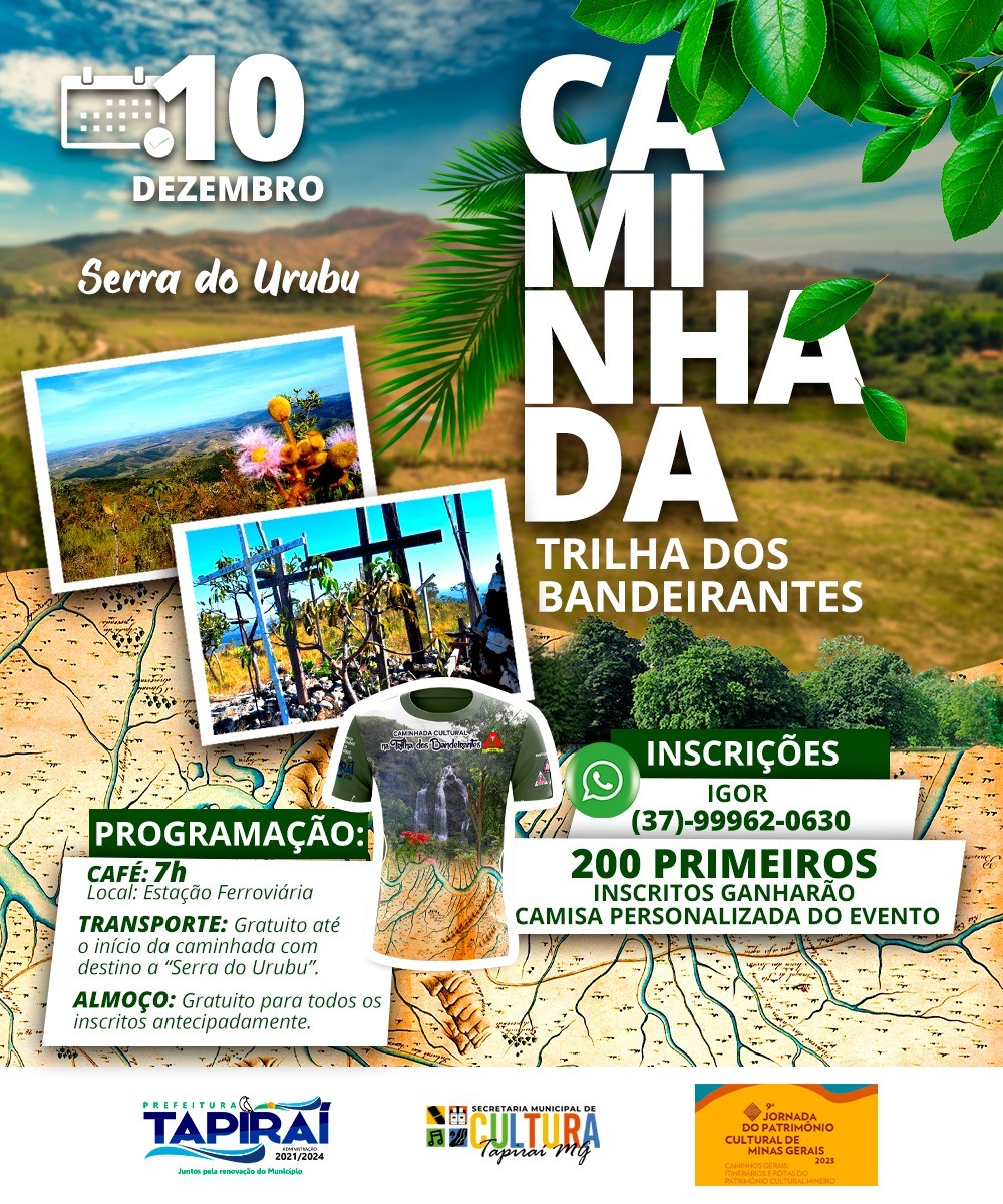 A Prefeitura Municipal de Tapiraí, através da Secretaria de Turismo, Cultura, Esporte e Lazer, promove no próximo dia (10.Dez.23), a Caminhada Trilha dos Bandeirantes, com destino a Serra do Urubu.