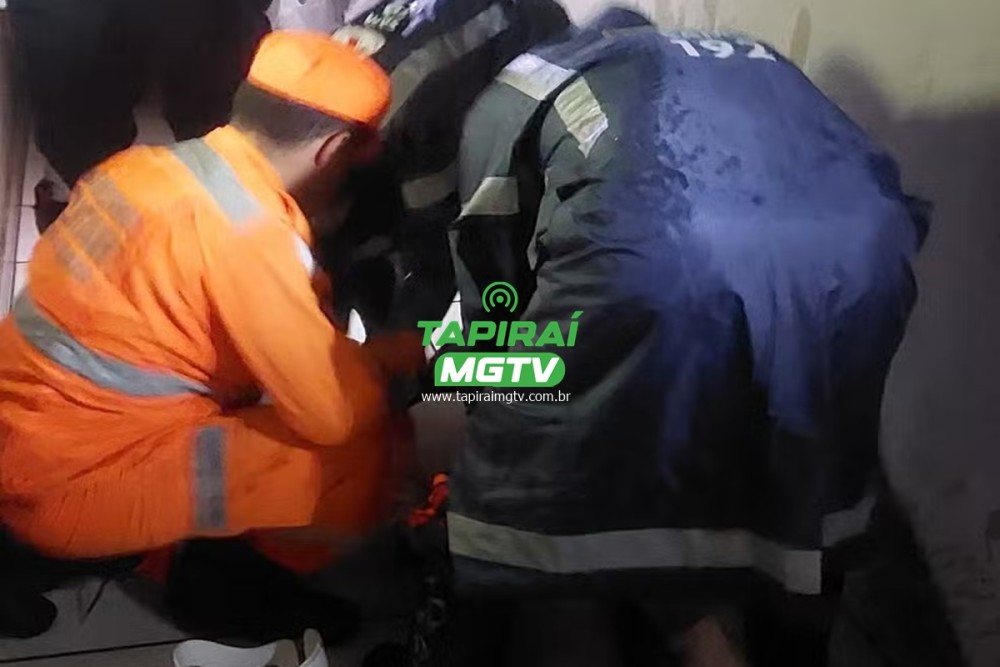 Para conseguir resgatar a vítima, os bombeiros e o Samu tiveram que arrombar a porta do apartamento do 1º andar, já que os moradores não estavam no momento.