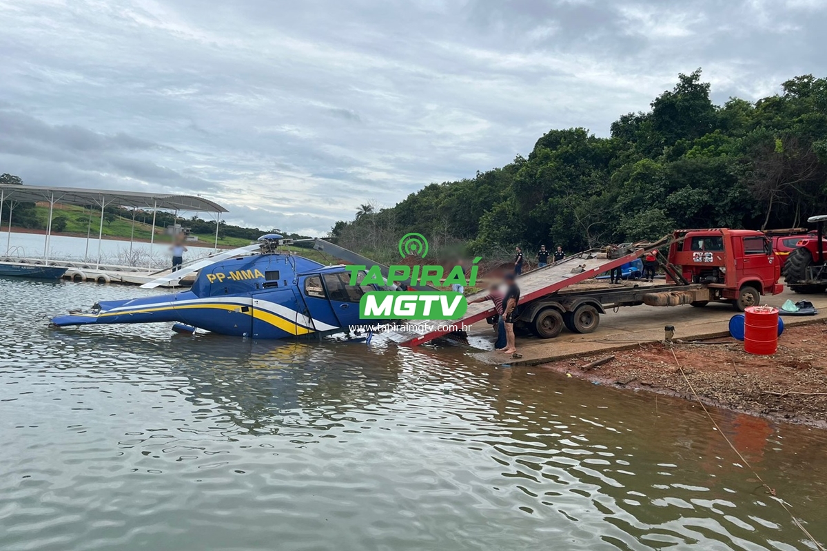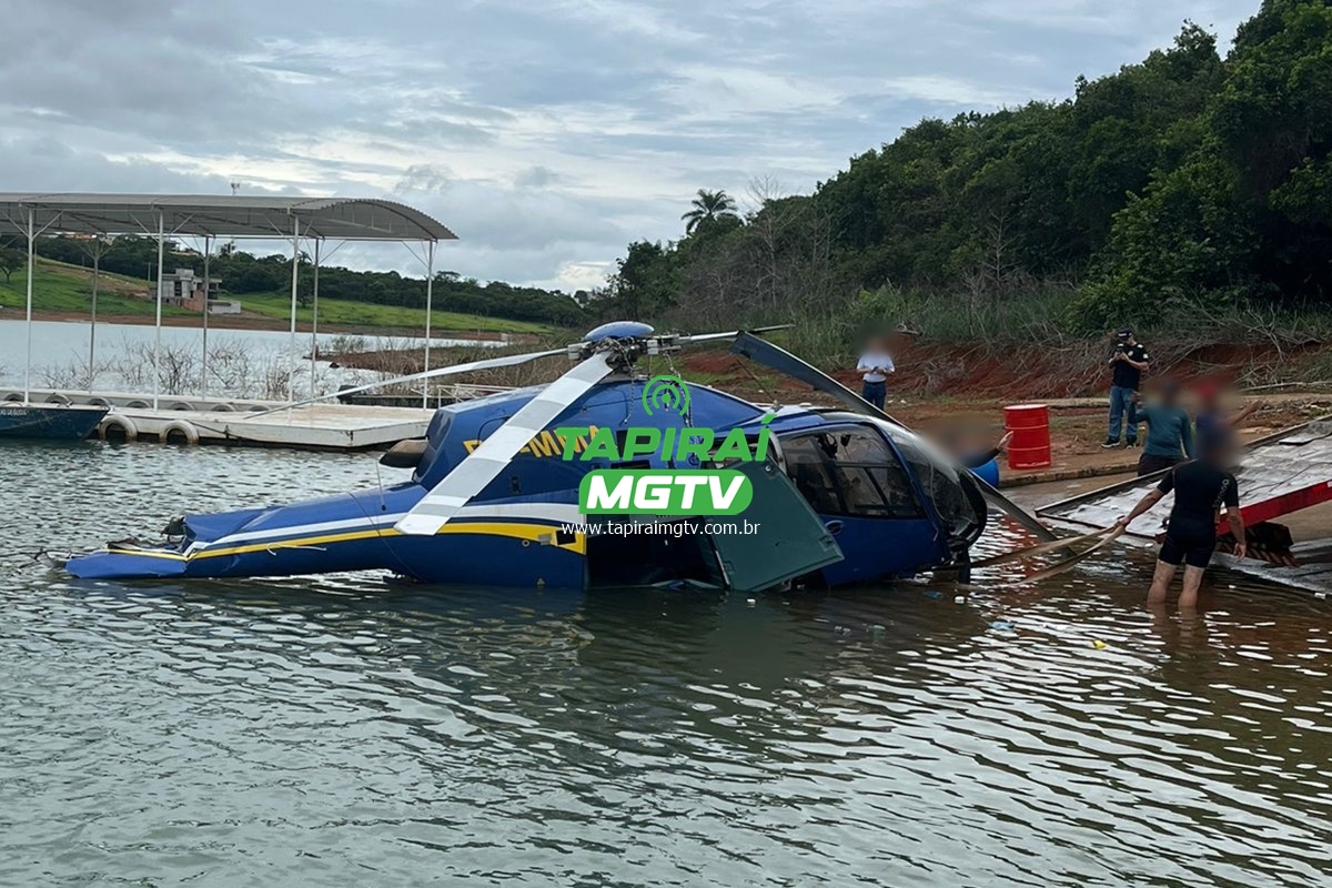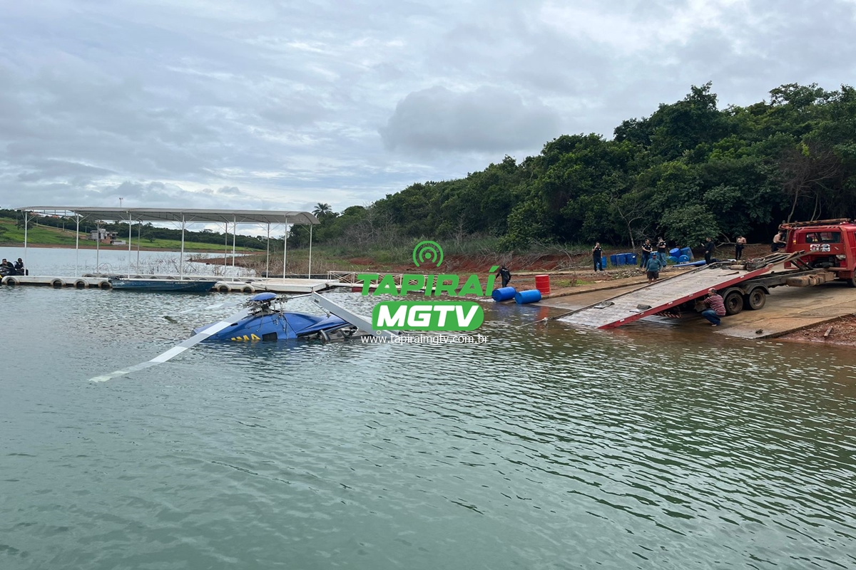 O helicóptero que caiu no Lago de Furnas, em Capitólio, foi retirado da água na tarde desta quarta-feira (03.Jan.24).