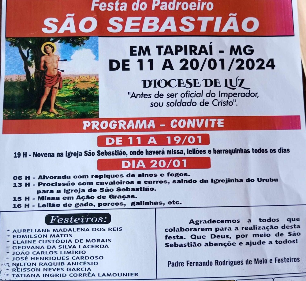 De 11 a 19 de janeiro, acontece a novena na Igreja São Sebastião, em Tapiraí. Haverá missas, leilões e barraquinhas todos os dias.