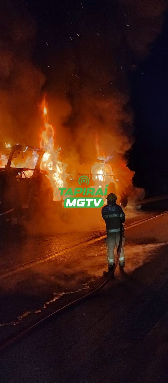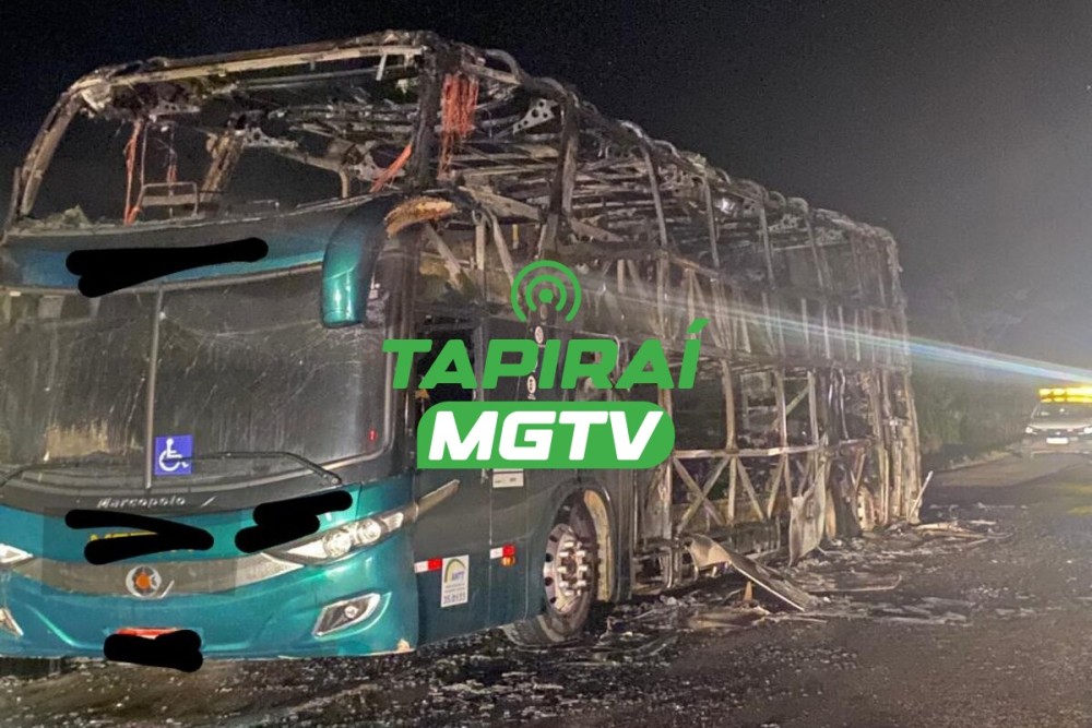 Um ônibus ficou totalmente destruído após pegar fogo na madrugada desta segunda-feira (12.Fev.24), após pegar fogo na BR-262, no município de Ibiá, no Alto Paranaíba. A ocorrência foi registrada por volta das 01h40, na altura do km 669.