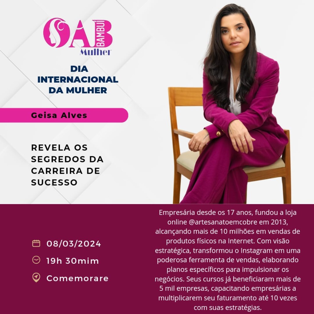Participe de uma noite memorável na OAB Mulher de Bambuí! Desfrute de uma palestra inspiradora com Geisa Alves, uma empresária visionária que transformou o Instagram em uma poderosa ferramenta de vendas.