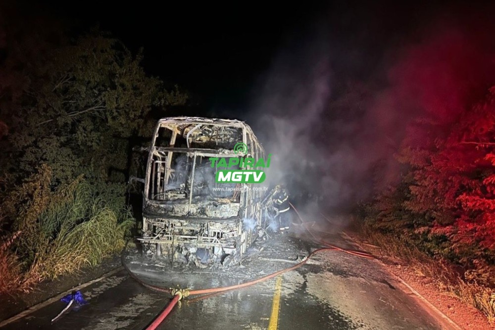 Um ônibus de turismo com 19 passageiros foi consumido pelo fogo na madrugada deste sábado (9) na MG-122, altura do km 170, em Janaúba, região Norte de Minas Gerais. Um dos passageiros teve sinais de intoxicação.