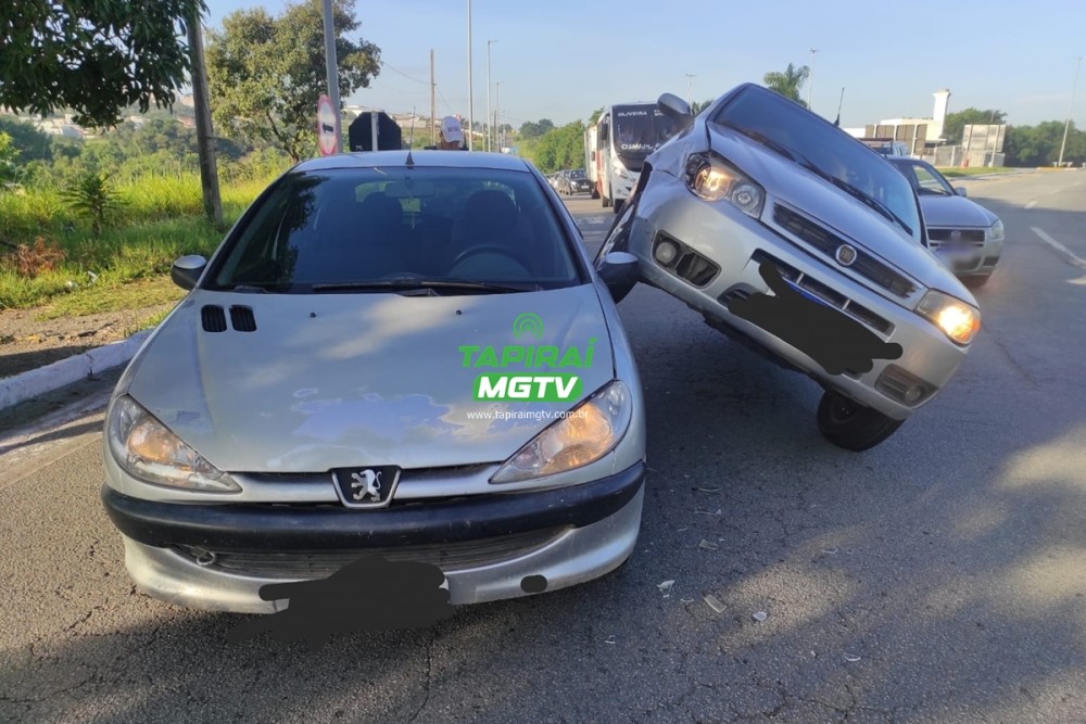 Um carro parou "em cima" de outro veículo após um acidente de trânsito na BR-494, em Divinópolis, na manhã desta quinta-feira (14.Mar.24). O acidente aconteceu por volta das 07h, na altura do KM 35.