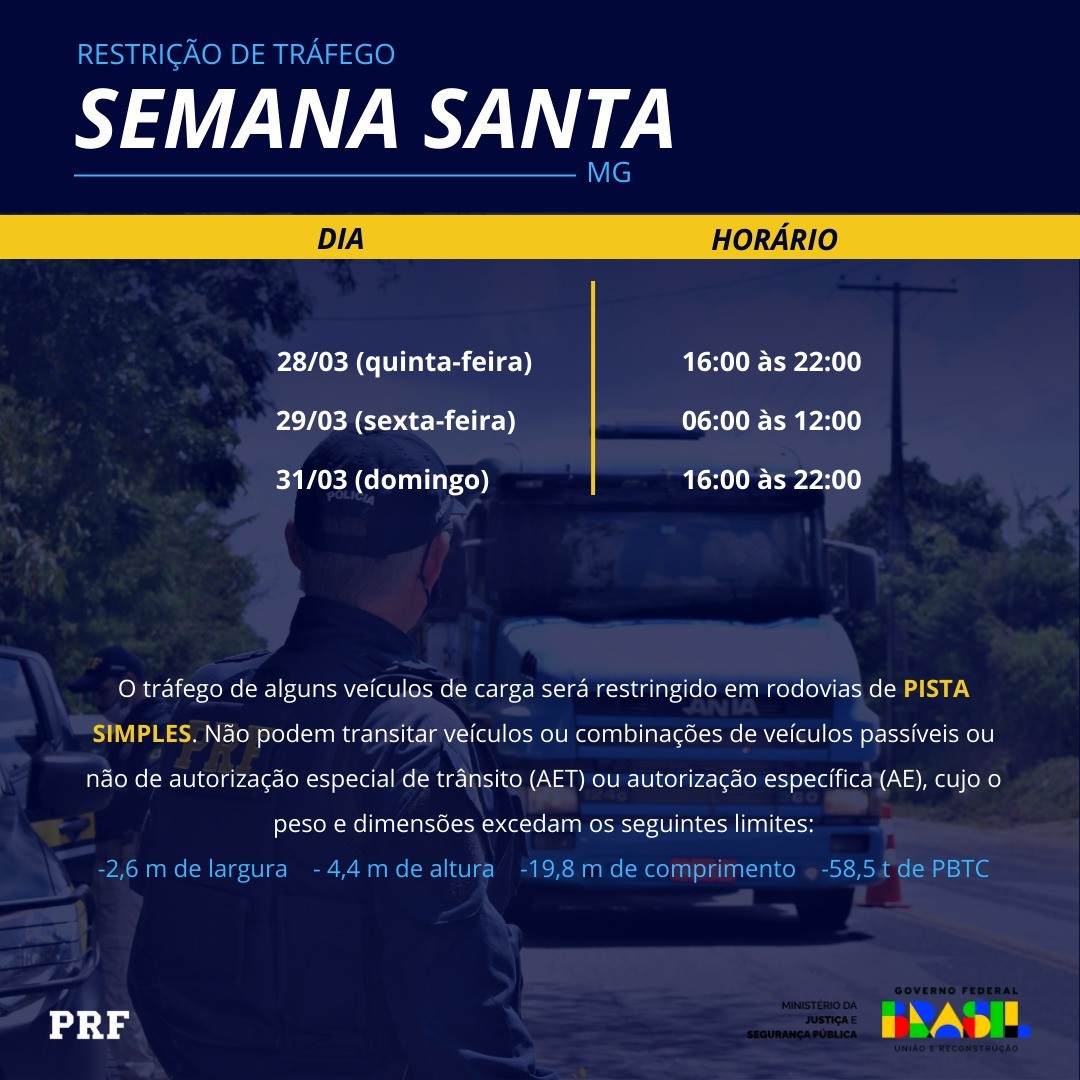 Para melhorar a fluidez e a segurança nas rodovias federais durante o feriado prolongado, o tráfego de alguns veículos de carga será restringido em determinados dias e horários, nas rodovias de pista simples. Não poderão transitar veículos ou combinações de veículos, passíveis ou não de Autorização Especial de Trânsito (AET), ou Autorização Específica (AE), cujo peso e dimensões excedam qualquer um dos seguintes limites: