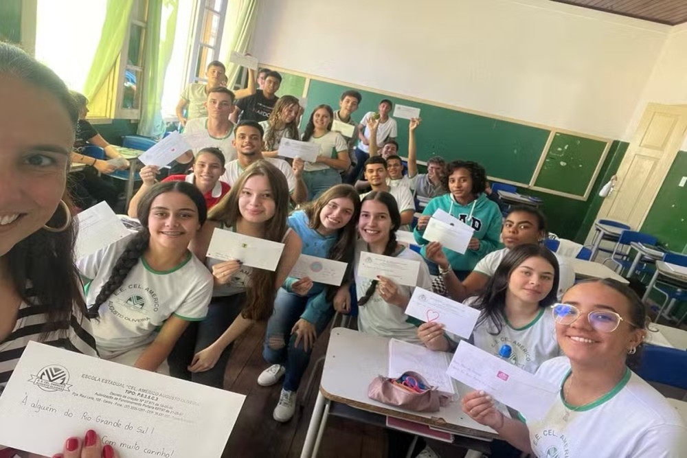 As cartas foram escritas a mão por 150 alunos, que têm entre 14 e 16 anos. "Tudo vai ficar bem", "Meus pêsames por suas perdas", "Amamos os gaúchos" estão entre as palavras elaboradas pelos adolescentes.