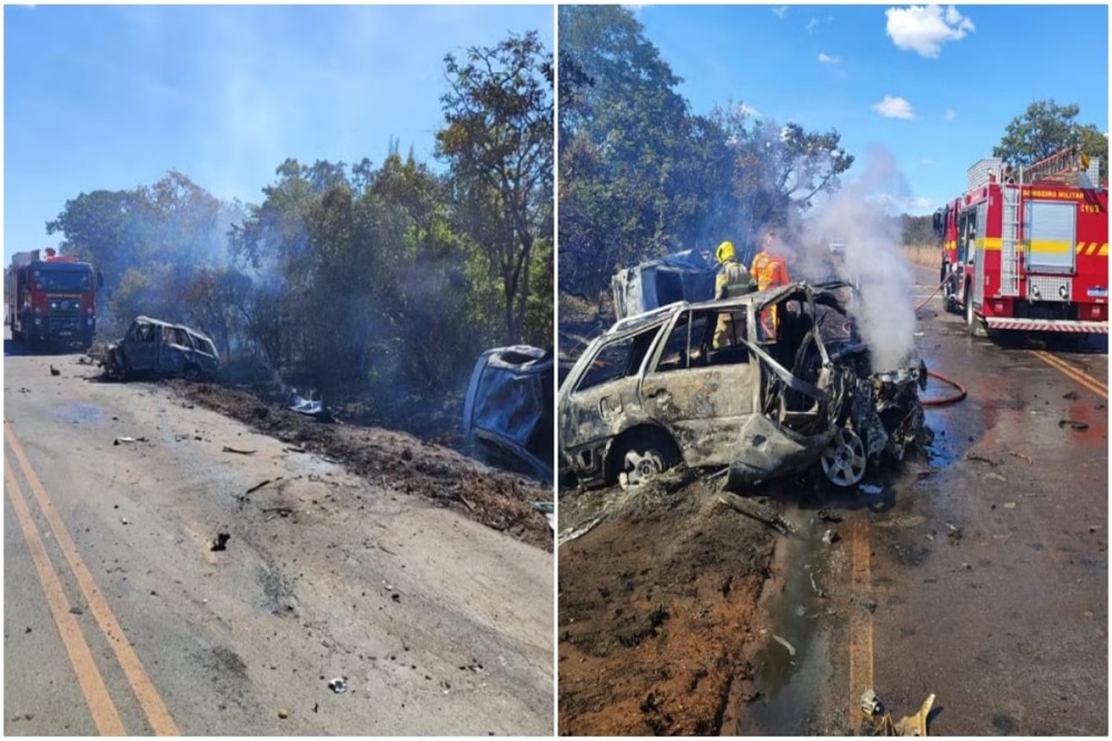 Segundo a polícia, com o impacto da batida, os automóveis saíram da pista e pegaram fogo.Conforme os bombeiros, os dois motoristas ficaram presos às ferragens.