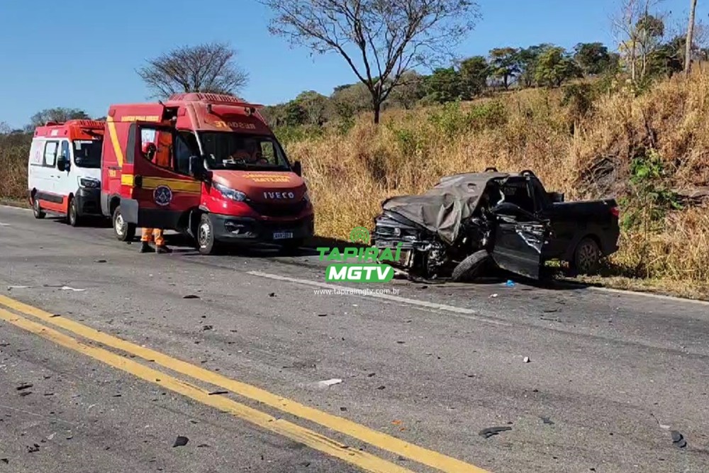 De o Corpo de Bombeiros, uma caminhonete Fiat/Strada seguia sentido Nova Serrana, quando bateu de frente com a carreta, que seguia no sentido oposto.