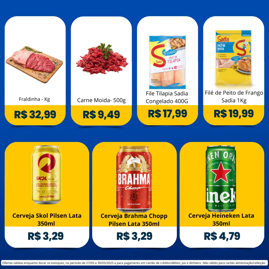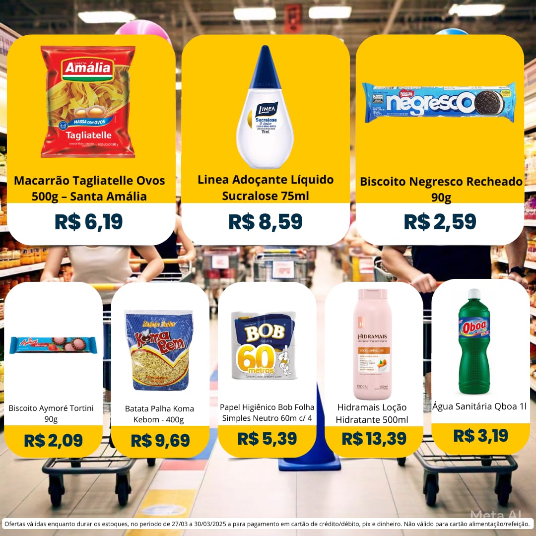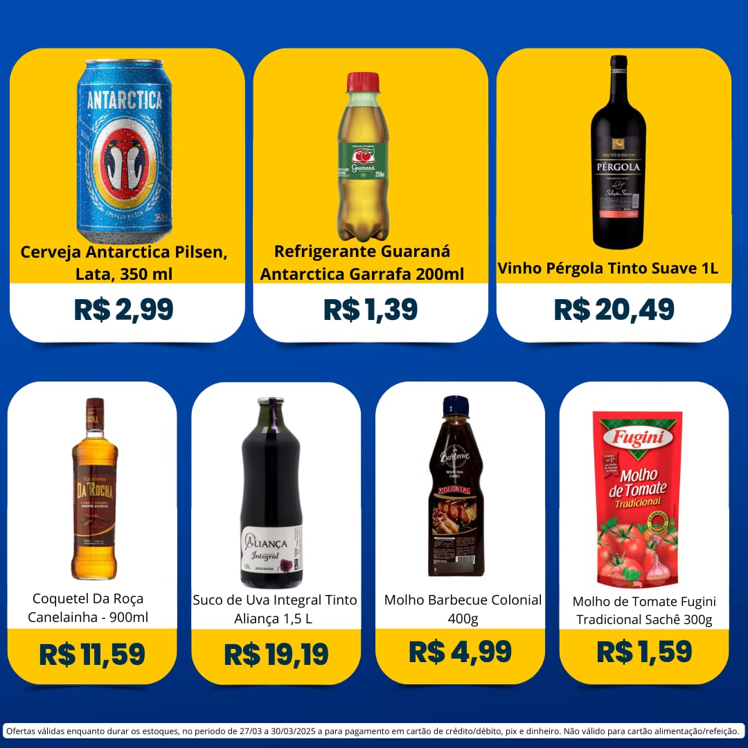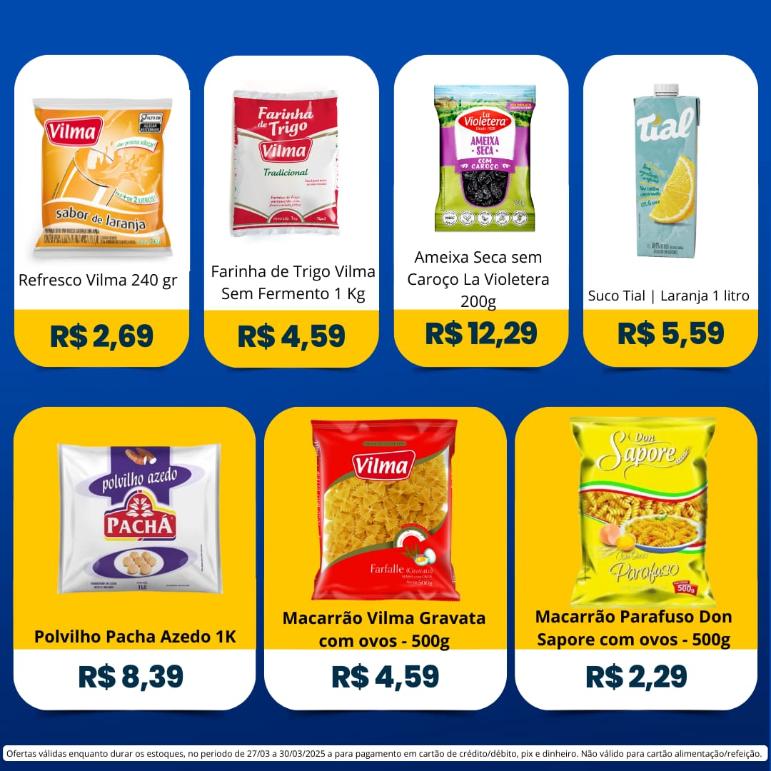 Ofertas válidas para pagamento em pix, dinheiro, cartão de crédito e debito, de 27/03 a 30/03, ou enquanto durarem os estoques.