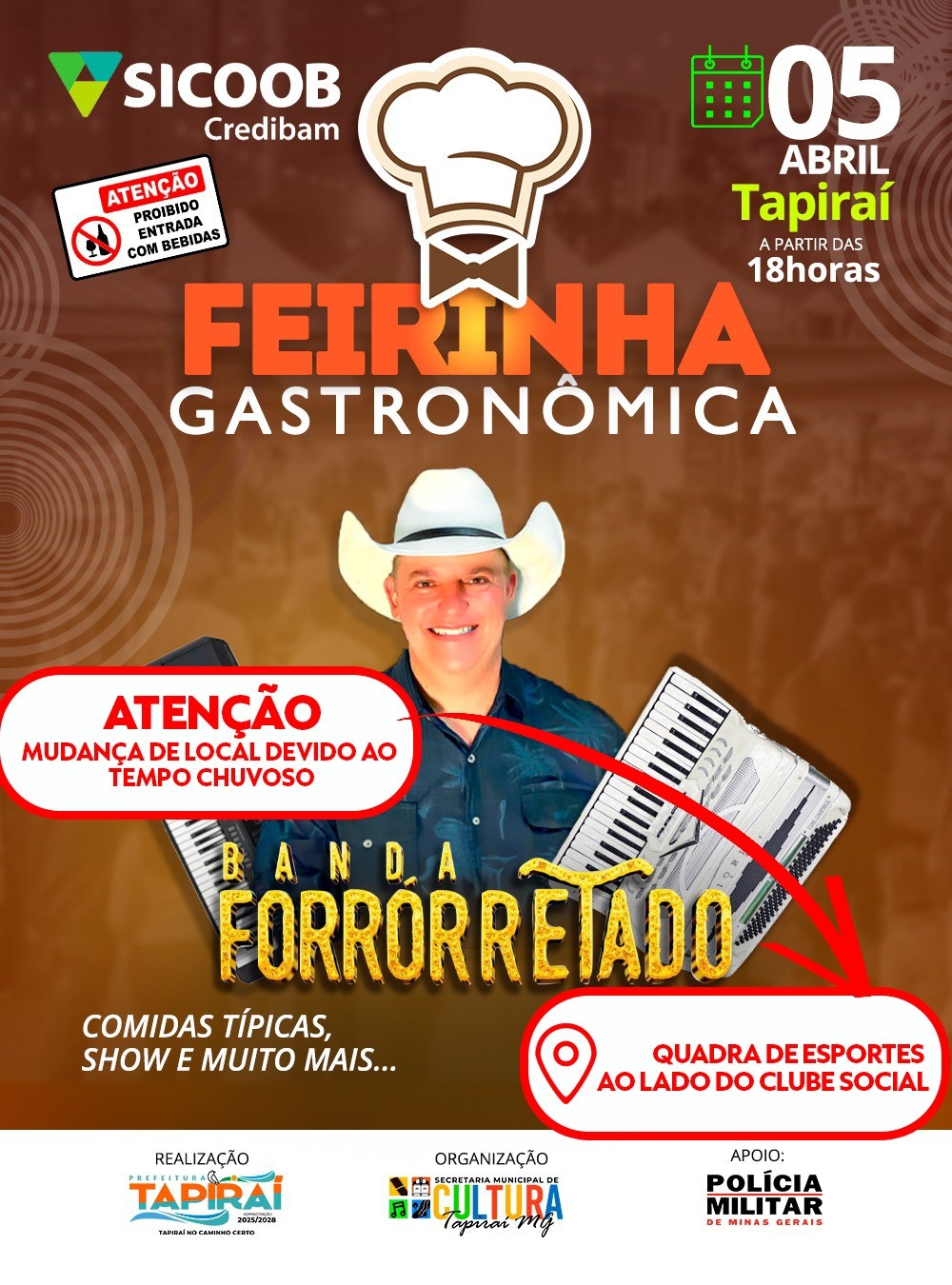 Neste sábado, 5 de abril, ocorrerá a Feirinha Gastronômica de Tapiraí, a partir das 18h. O evento que seria realizado na Praça da Estação Ferroviária, foi transferido para a Quadra de Espertes do Clube Social devido ao tempo chuvoso.