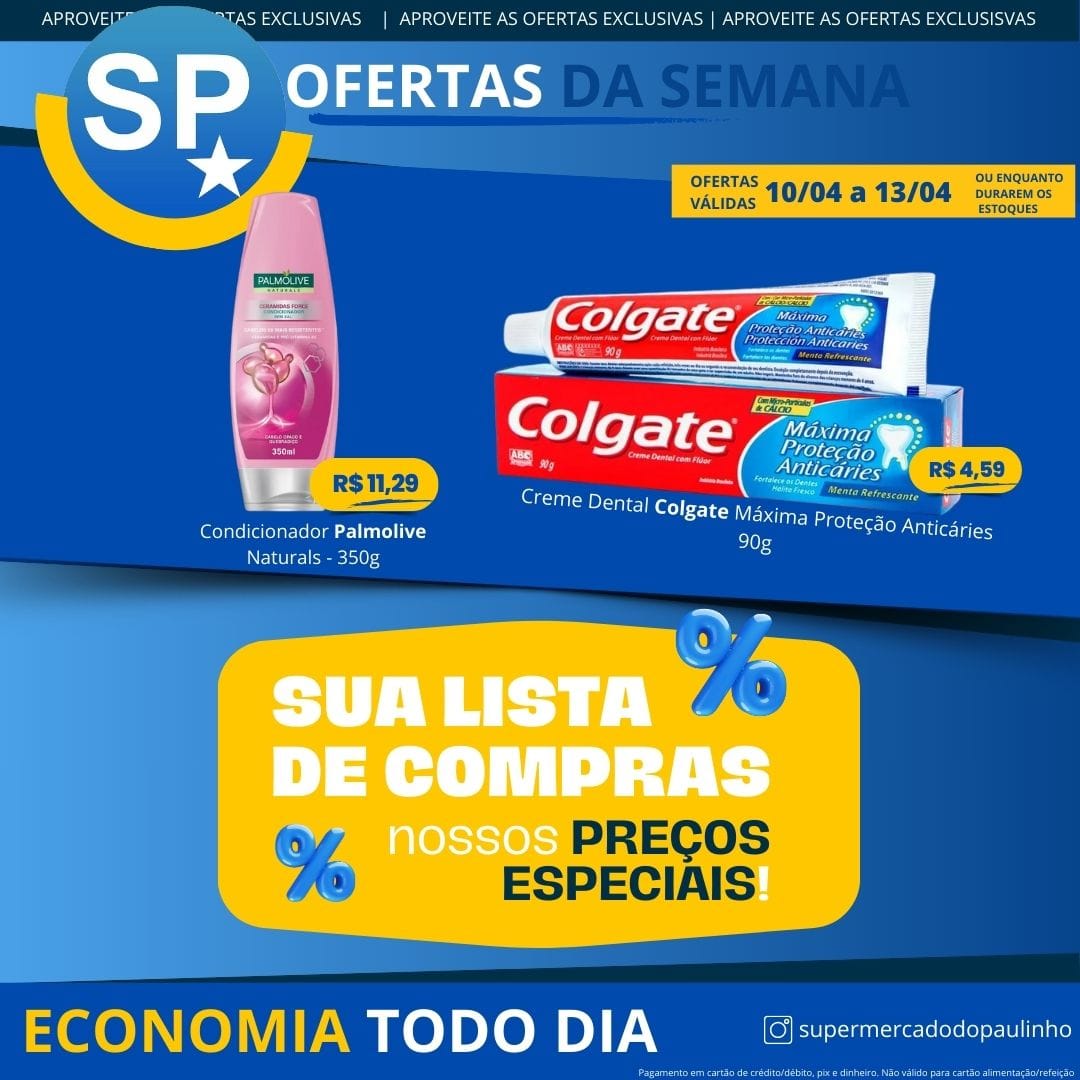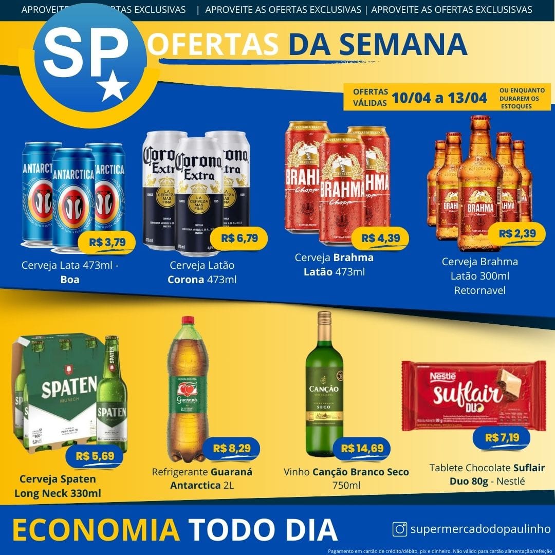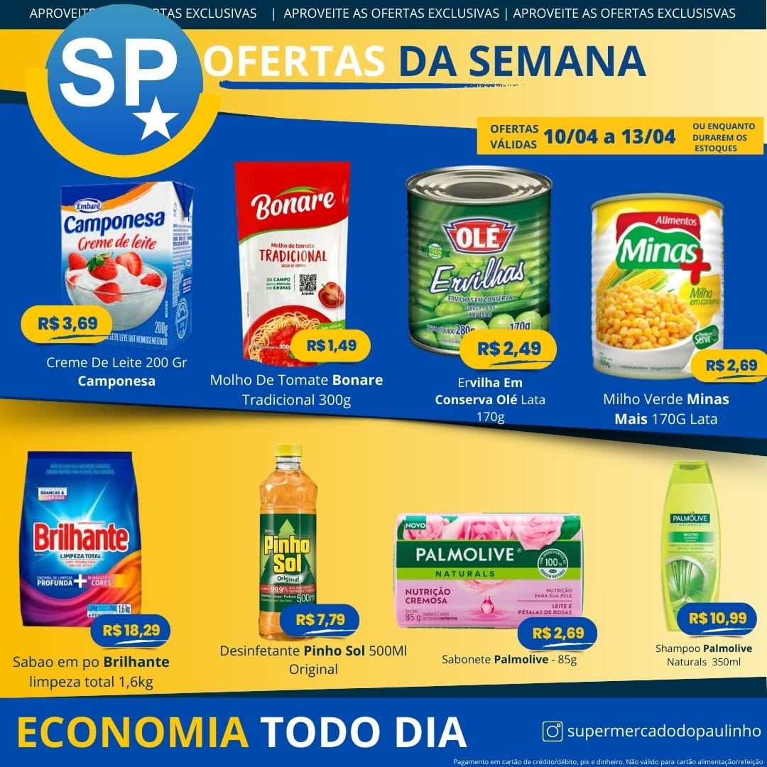Ofertas válidas para pagamento em pix, dinheiro, cartão de crédito e debito, de 10/04 a 13/04, ou enquanto durarem os estoques.