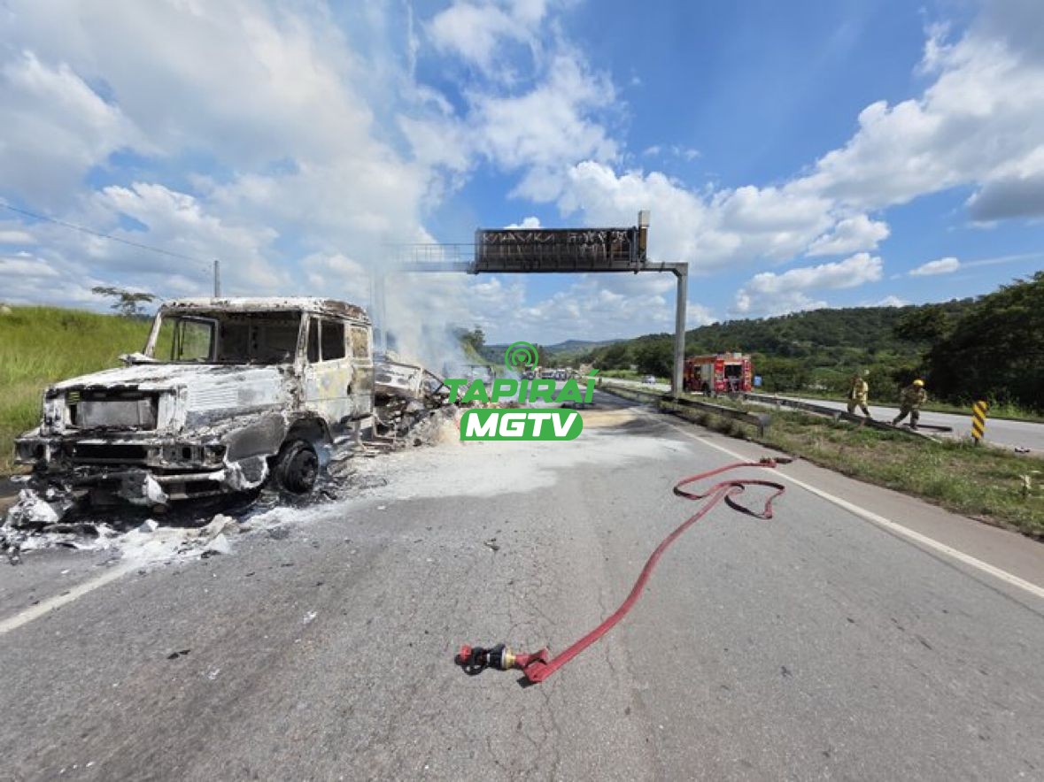 Uma carreta pegou fogo e ficou totalmente destruída na manhã desta segunda-feira (21/04/25), no km 408 da BR-262, em Igaratinga, próximo a Pará de Minas.