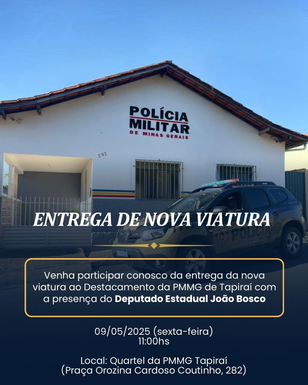 A Polícia Militar convida toda a população para participar da solenidade de entrega da nova viatura do Destacamento da PMMG de Tapiraí, com a presença do Deputado Estadual João Bosco.