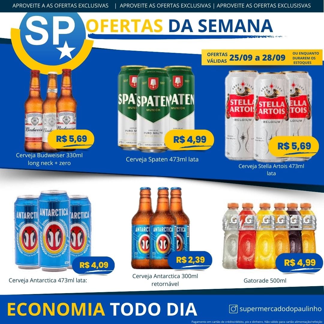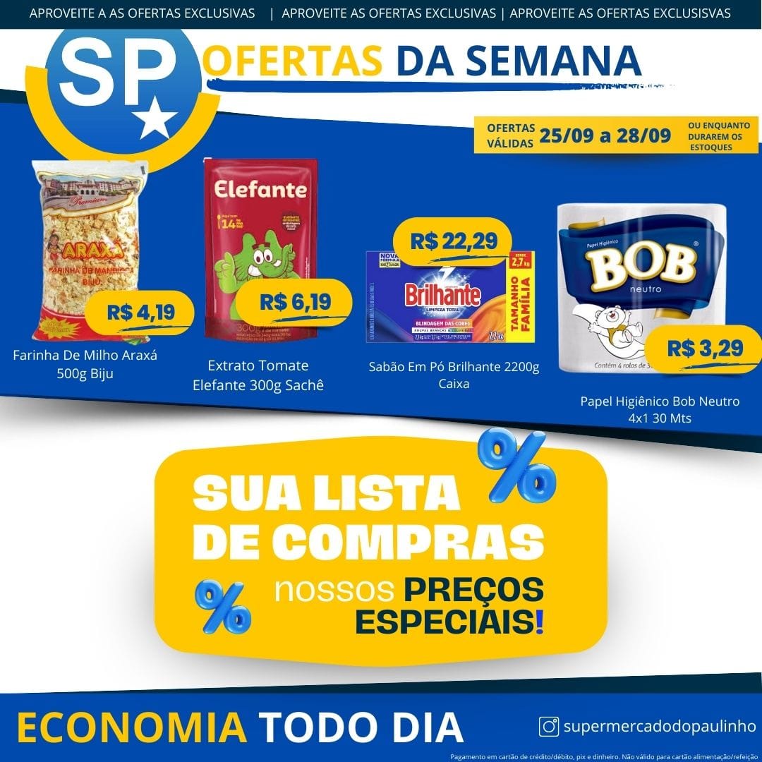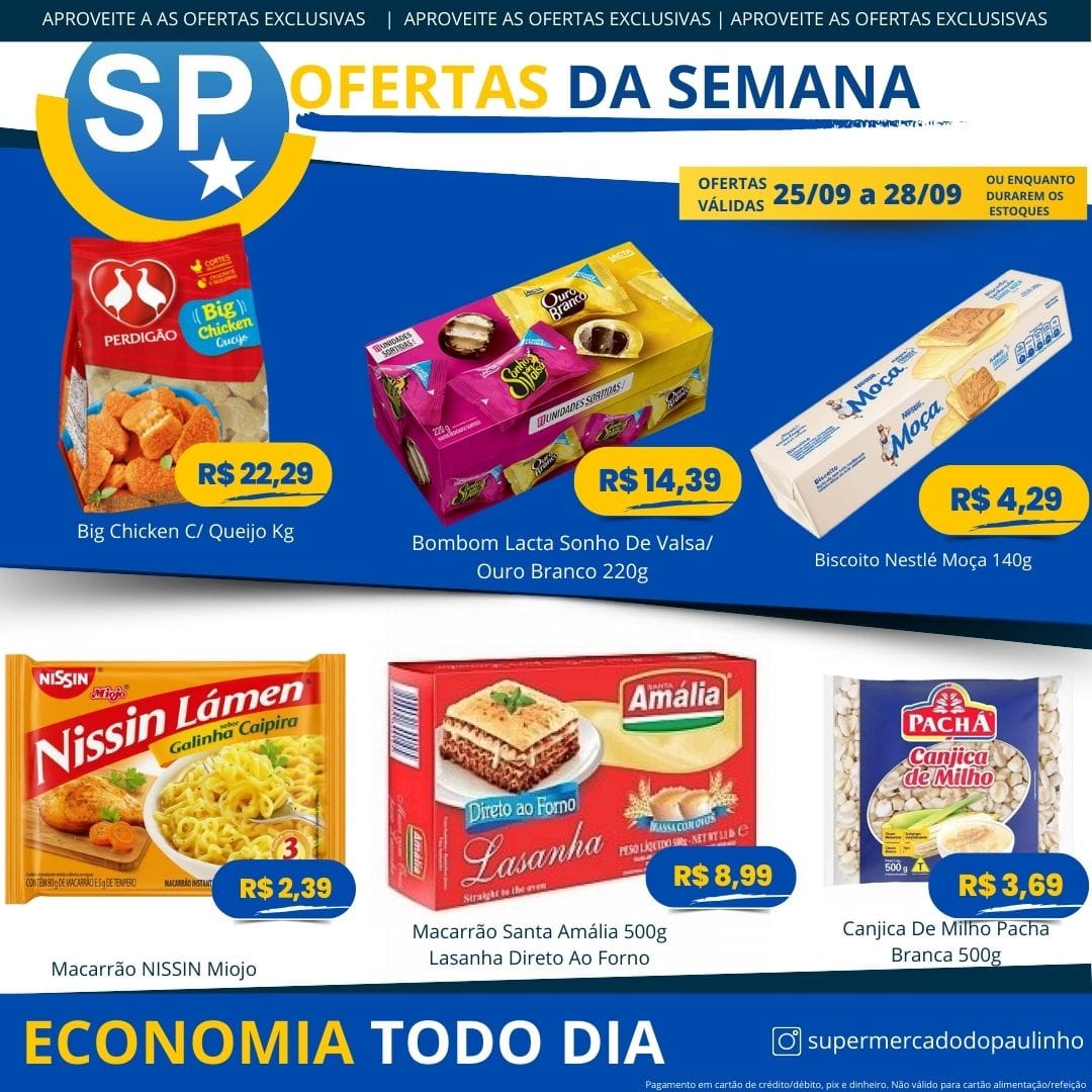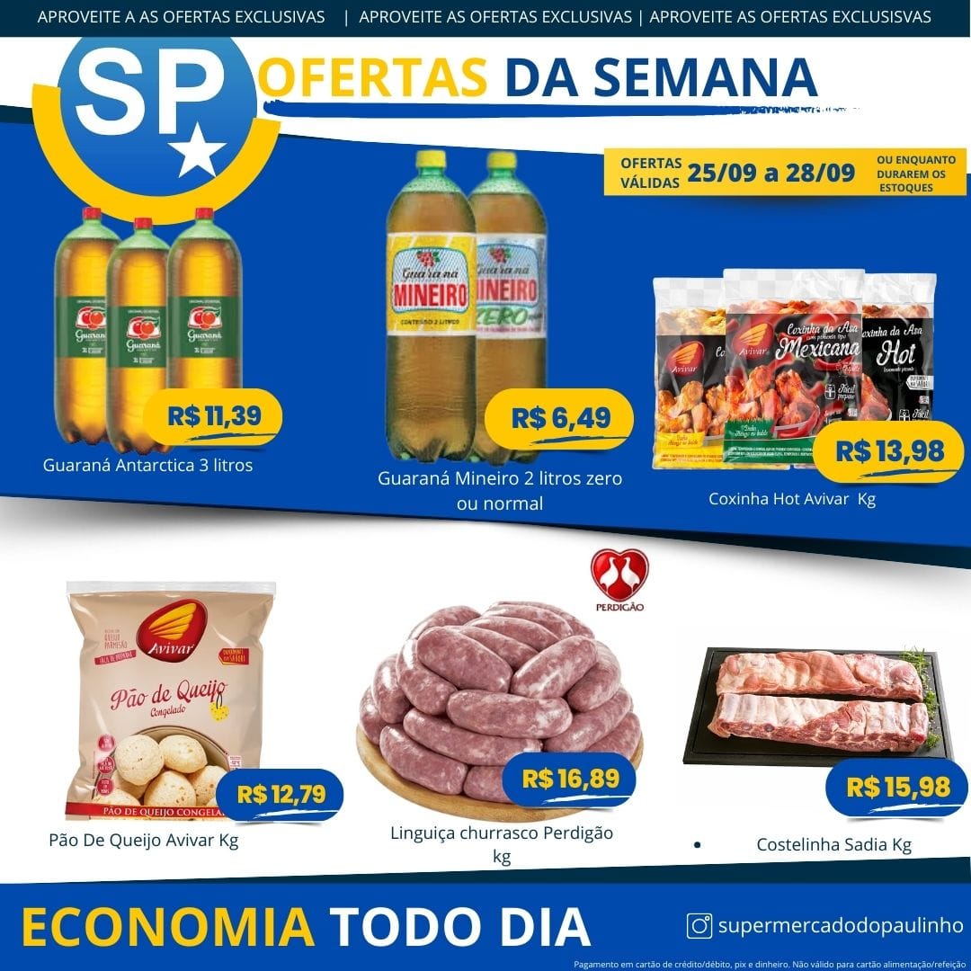Ofertas válidas para pagamento em pix, dinheiro, cartão de crédito e débito, de 25/09 a 28/09, ou enquanto durarem os estoques.