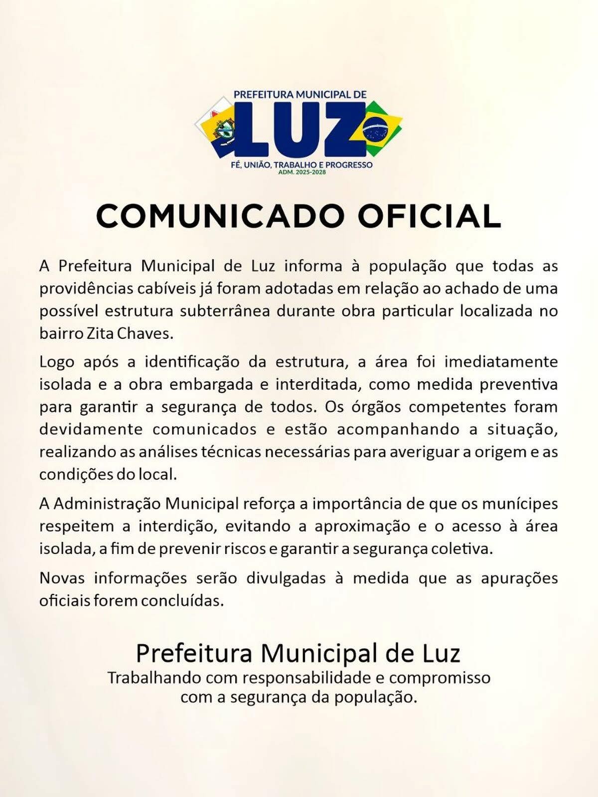 A Prefeitura de Luz informou que o local foi interditado e que os órgãos responsáveis já foram comunicados. Eles estão acompanhando a situação e realizando as análises técnicas necessárias para entender a origem e as condições dessa estrutura.