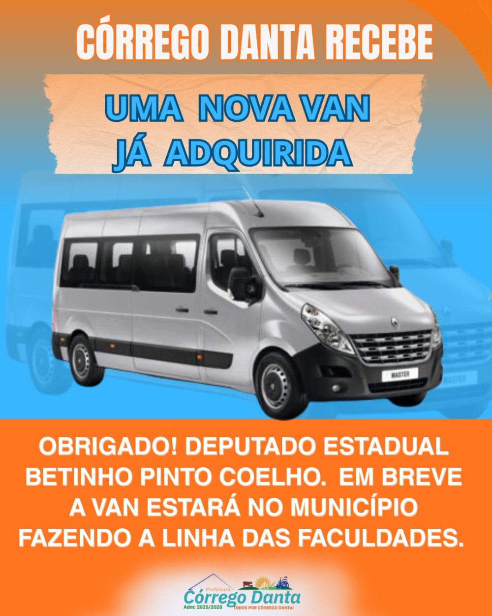 Mais uma conquista para Córrego Danta! A Administração Municipal informou que uma nova van foi adquirida e, em breve, estará à disposição para a população.