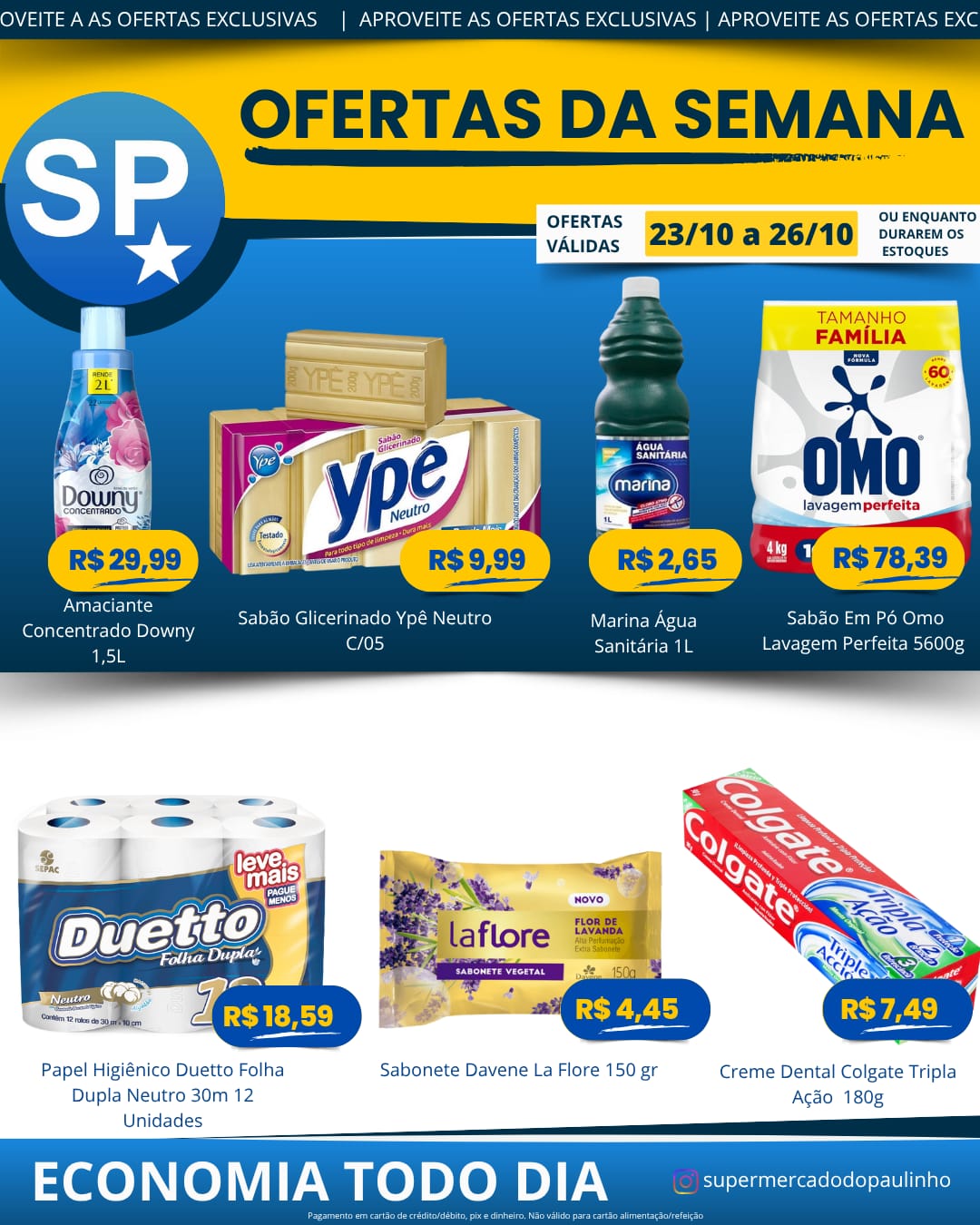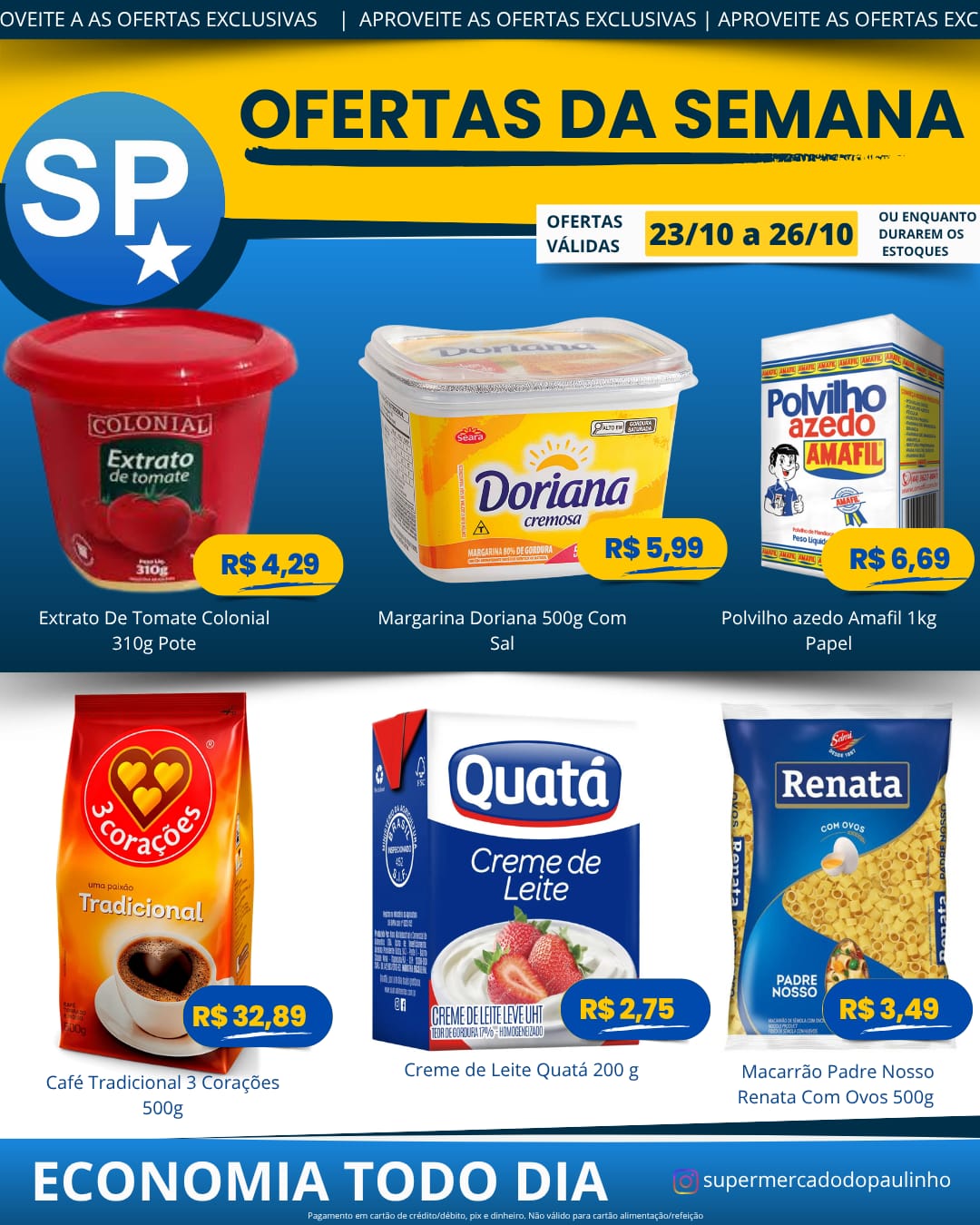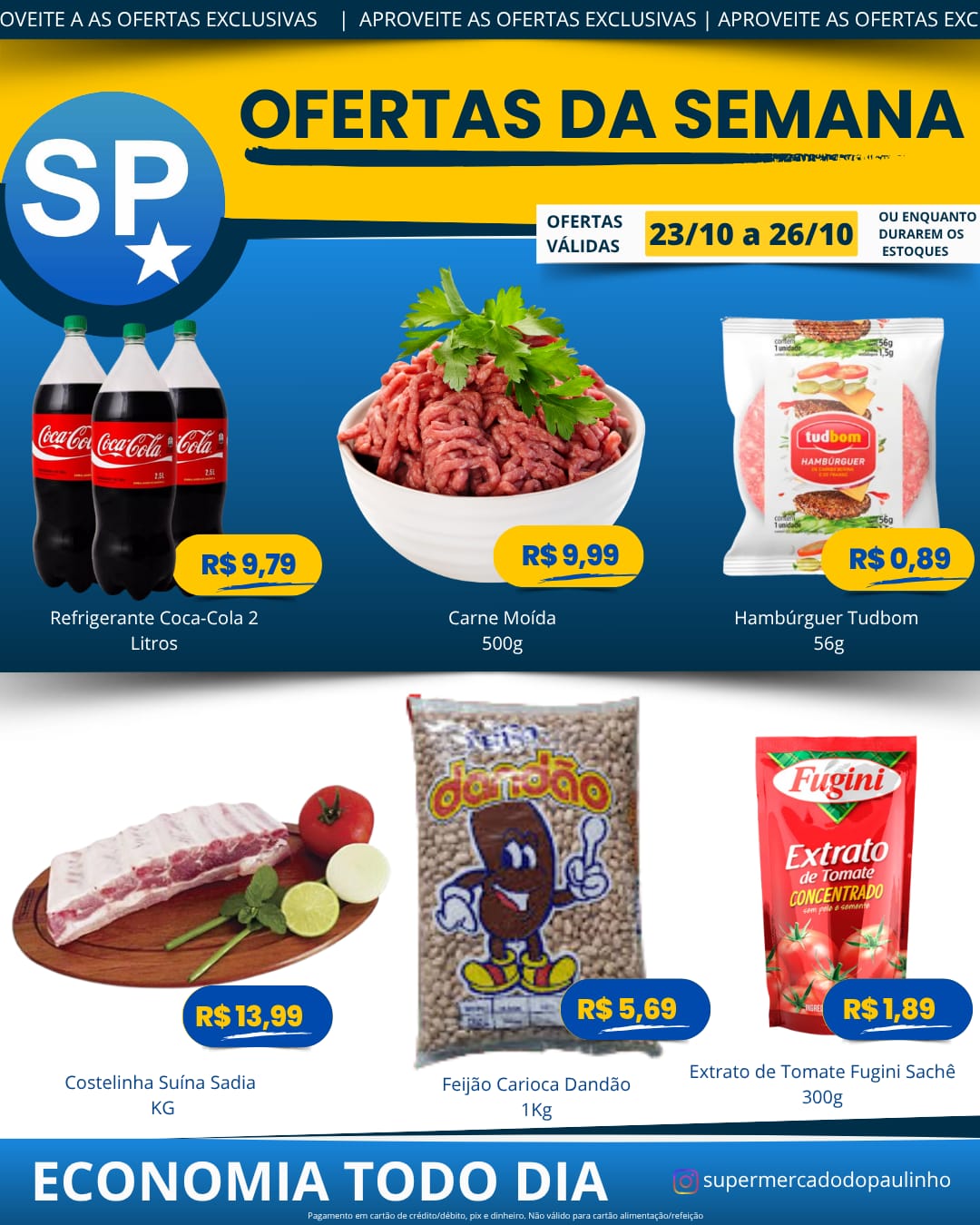 Ofertas válidas para pagamento em pix, dinheiro, cartão de crédito e débito, de 23/10 a 26/10, ou enquanto durarem os estoques.