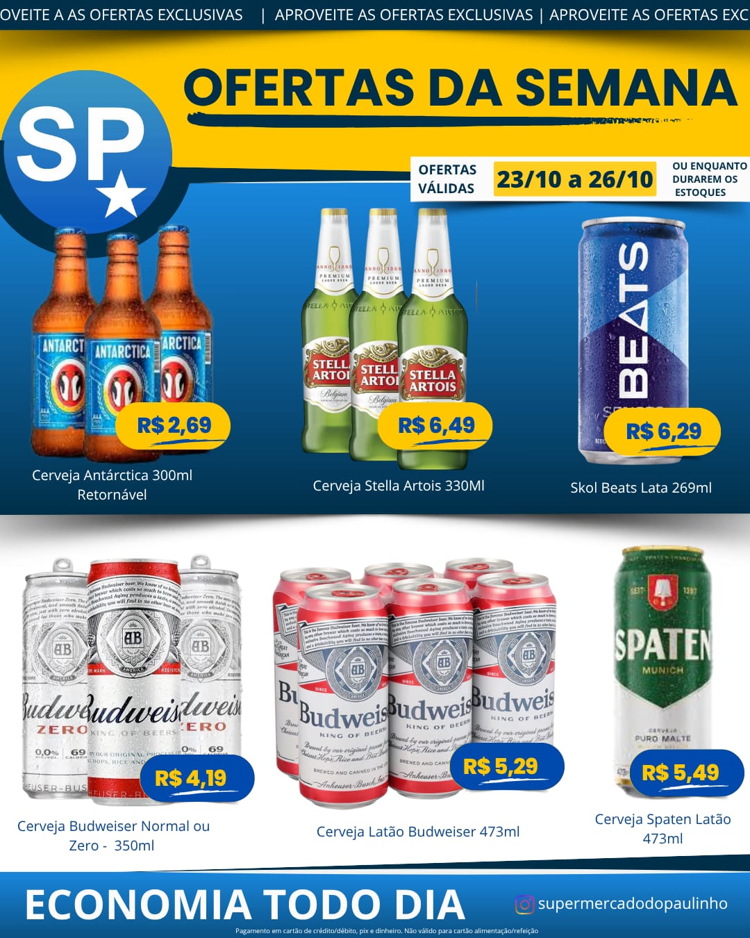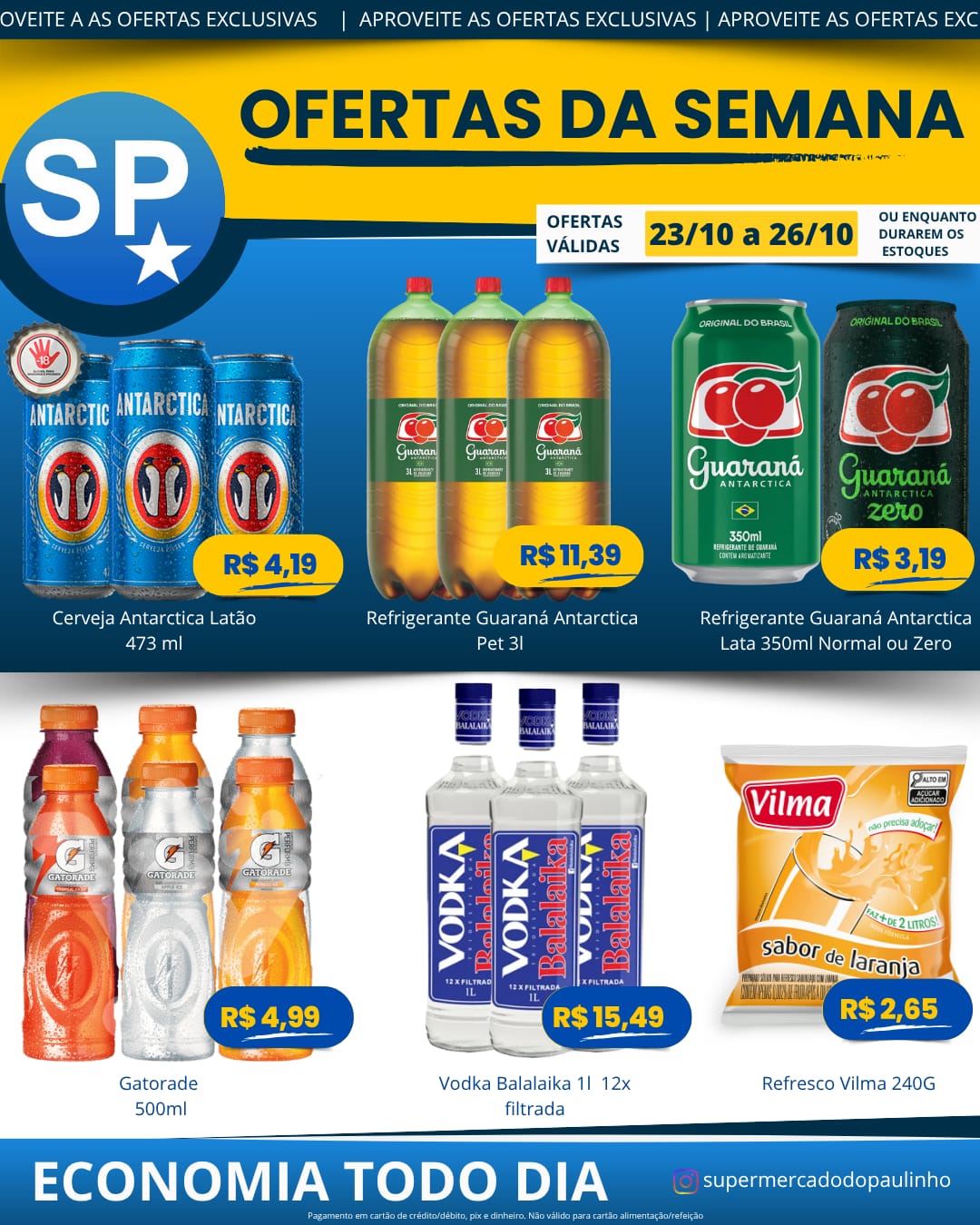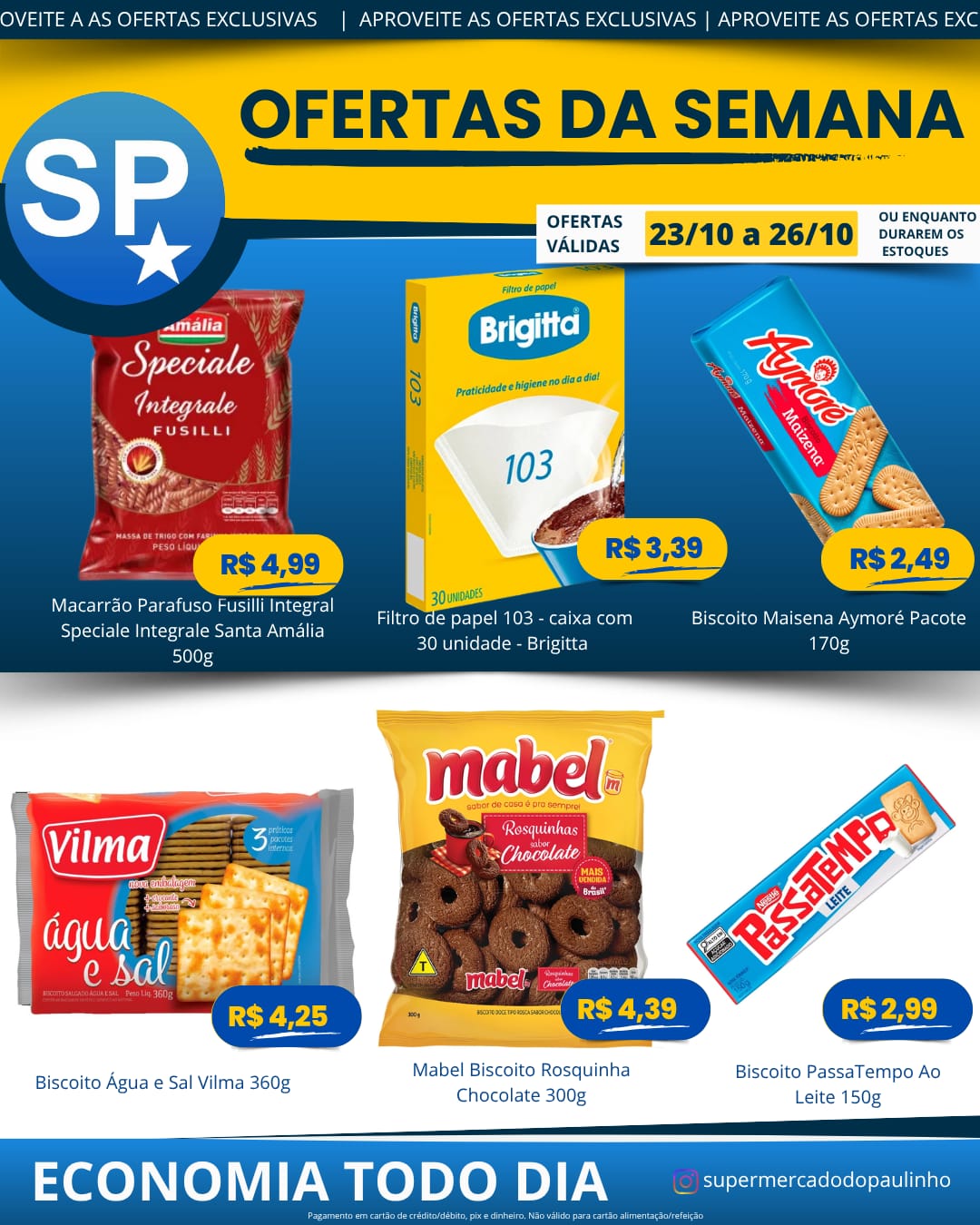 Ofertas válidas para pagamento em pix, dinheiro, cartão de crédito e débito, de 23/10 a 26/10, ou enquanto durarem os estoques.