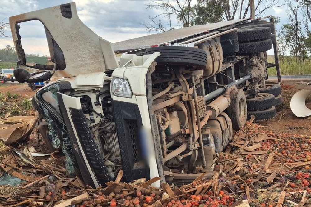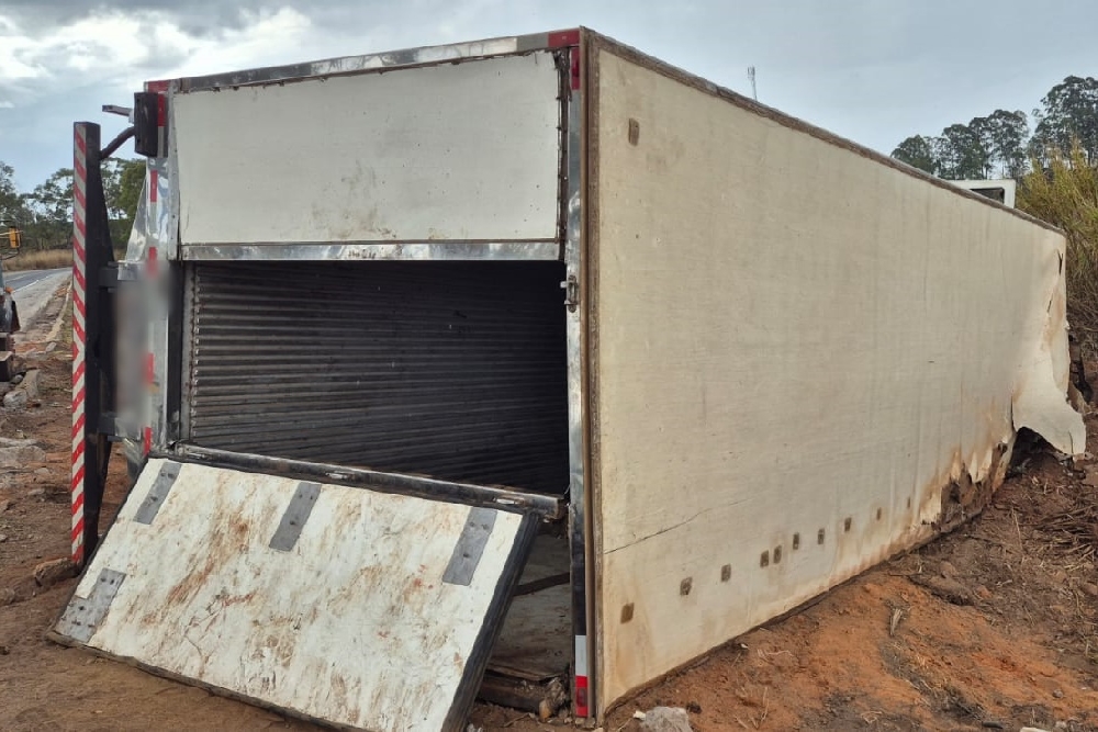 Um caminhão frigorífico tombou no início da tarde desta segunda-feira (27/10) na BR-262, no município de Campos Altos. O acidente aconteceu por volta das 13h, na altura do KM 576.