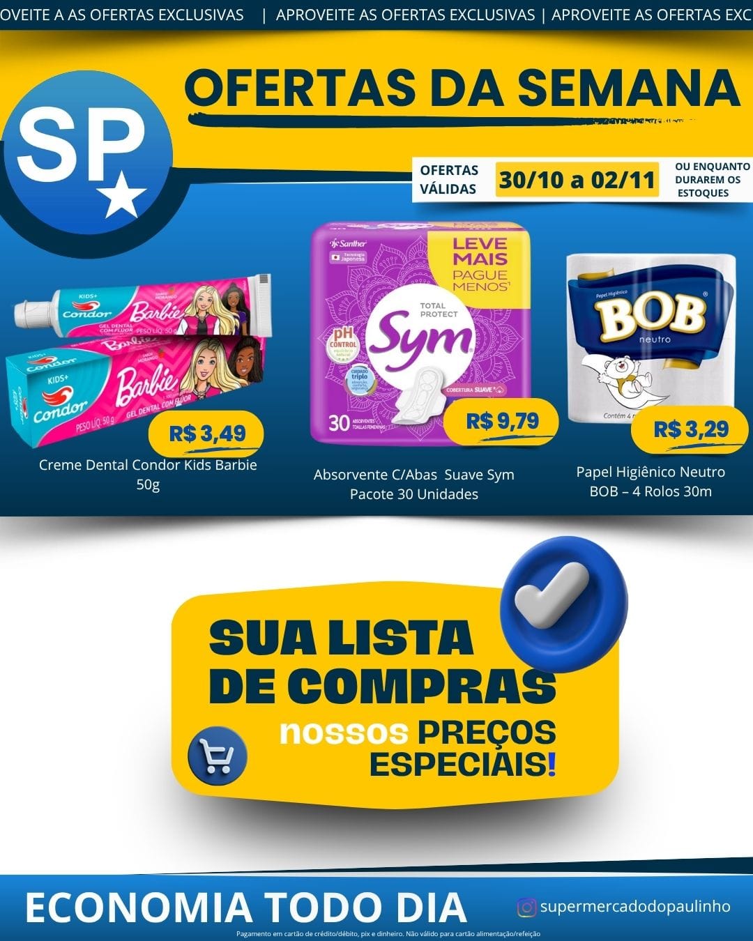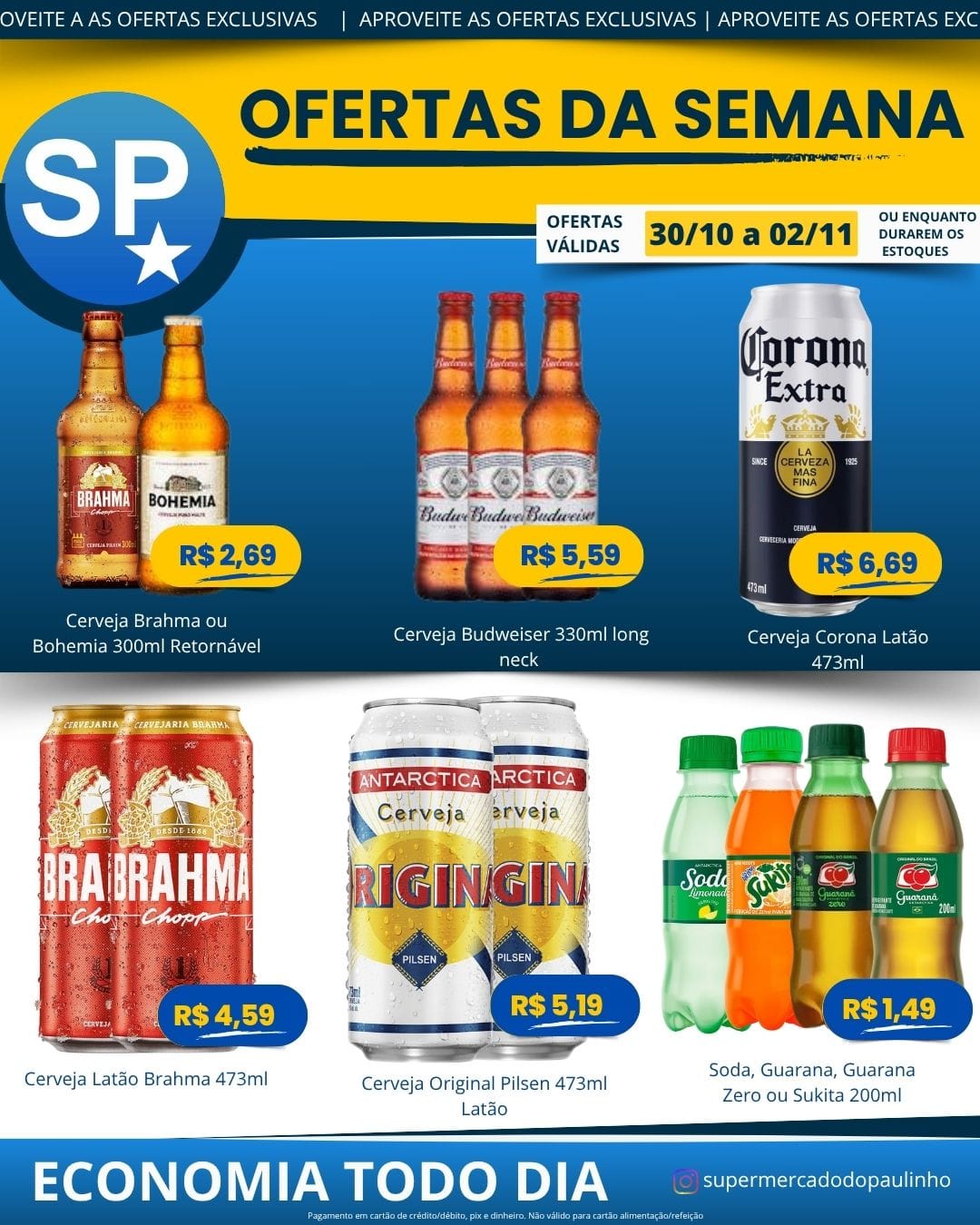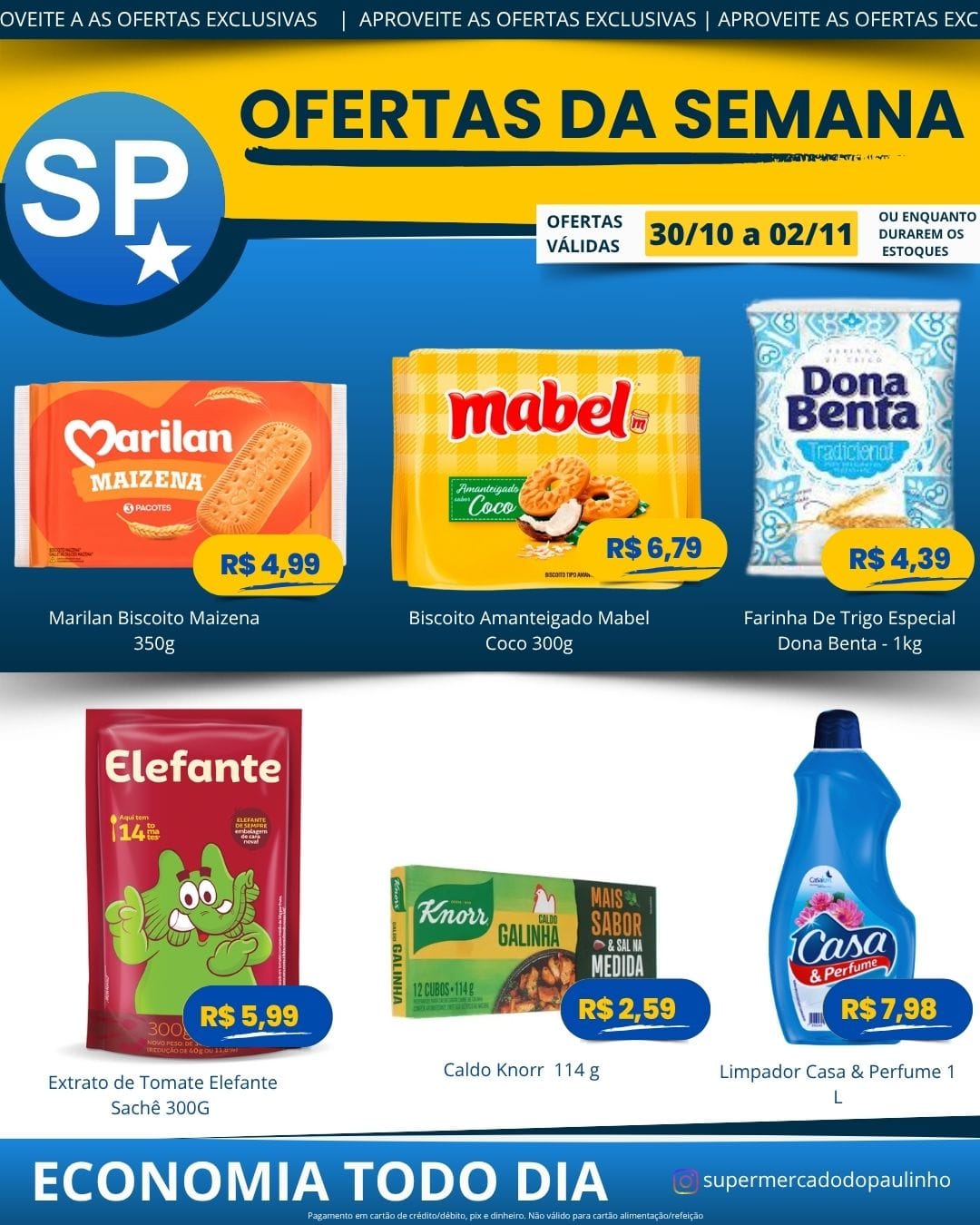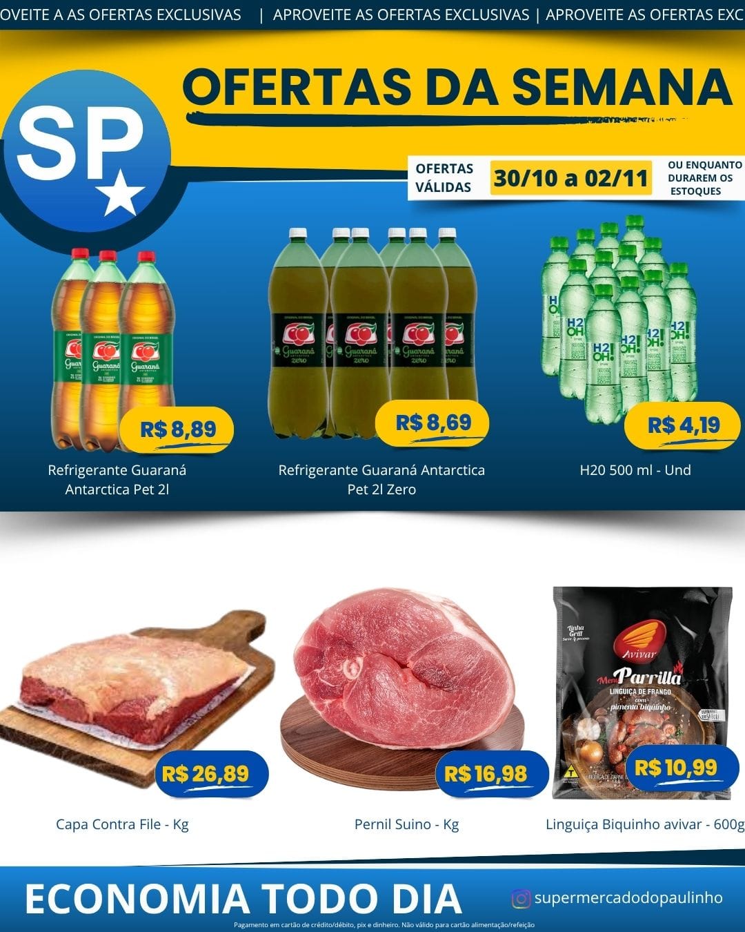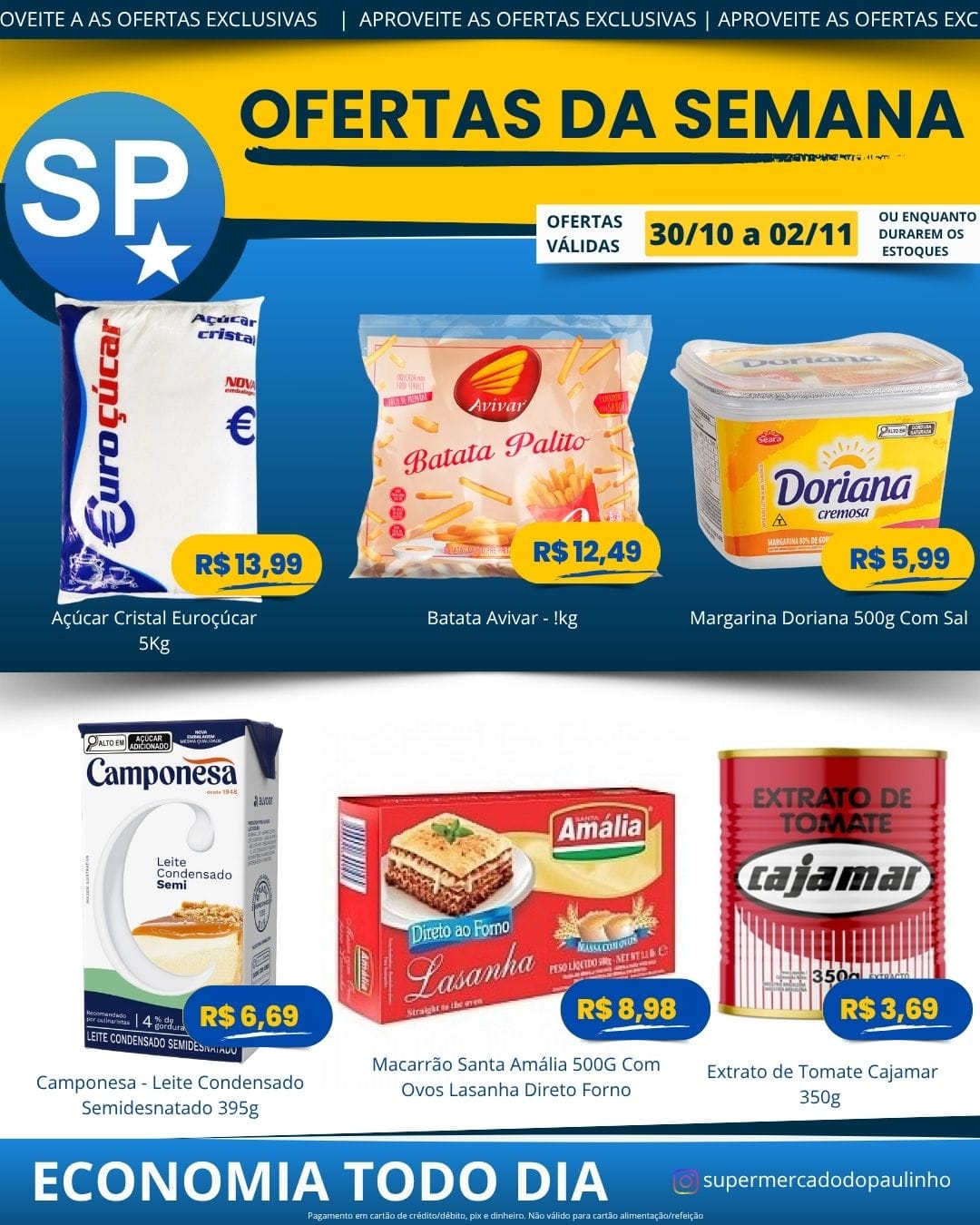 Ofertas válidas para pagamento em pix, dinheiro, cartão de crédito e débito, de 30/10 a 02/11, ou enquanto durarem os estoques.