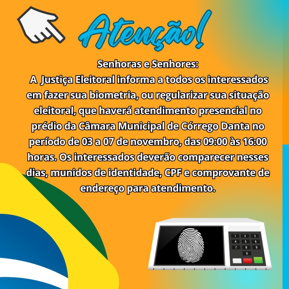 A Justiça Eleitoral informa que haverá atendimento presencial para biometria e regularização da situação eleitoral no prédio da Câmara Municipal de Córrego Danta, de 03 a 07 de novembro, das 09:00 às 16:00.