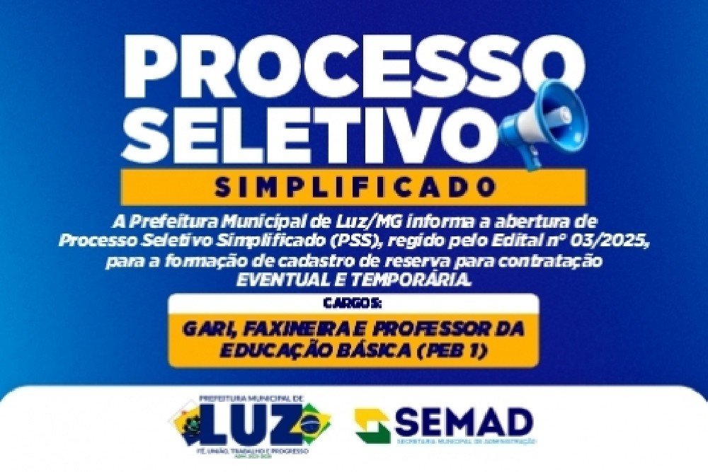 A Prefeitura Municipal de Luz informa a abertura de Processo Seletivo Simplificado (PSS), regido pelo Edital n° 03/2025, para a formação de cadastro de reserva para contratação EVENTUAL E TEMPORÁRIA.