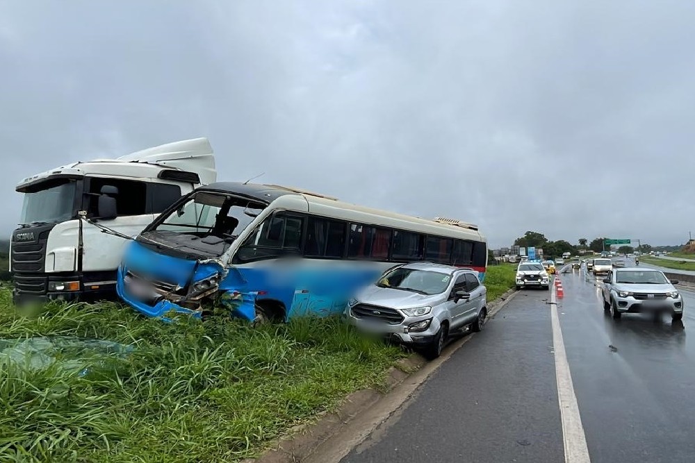 Após a colisão inicial, o motorista do micro-ônibus também perdeu o controle e acabou colidindo na lateral de uma carreta Scania, cujo condutor tem 40 anos.