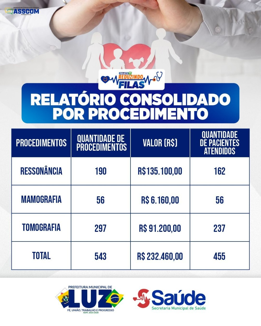 Com o investimento, foram realizados 543 procedimentos, entre ressonâncias magnéticas, mamografias e tomografias. Ao todo, 455 pacientes foram contemplados, contribuindo para a redução das filas de espera e ampliando o acesso da população a diagnósticos essenciais.