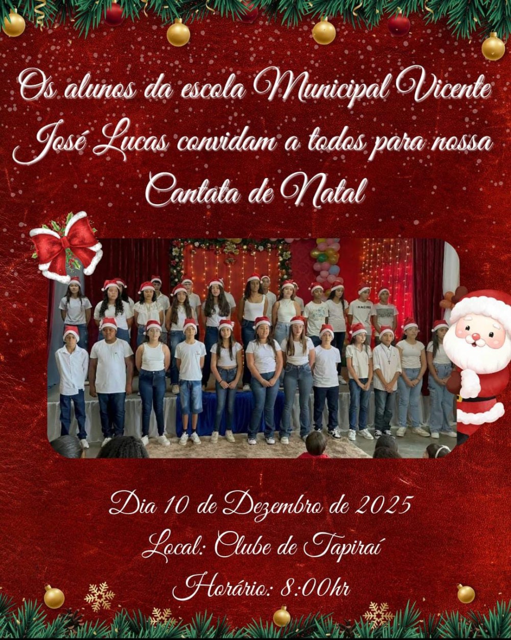 Os alunos da escola Municipal Vicente José Lucas de Tapiraí convidam toda população para prestigiarem a Cantata de Natal.