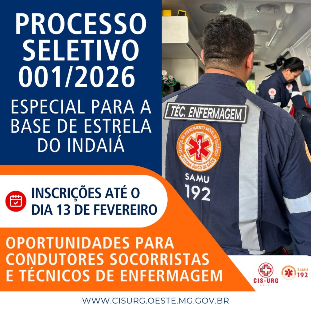 O CIS-URG Oeste está com inscrições abertas para o Processo Seletivo Simplificado nº 001/2026, destinado à contratação de Condutores Socorristas e Técnicos de Enfermagem para a nova base descentralizada do Serviço de Atendimento Móvel de Urgência (Samu), que será inaugurada no município de Estrela do Indaiá.