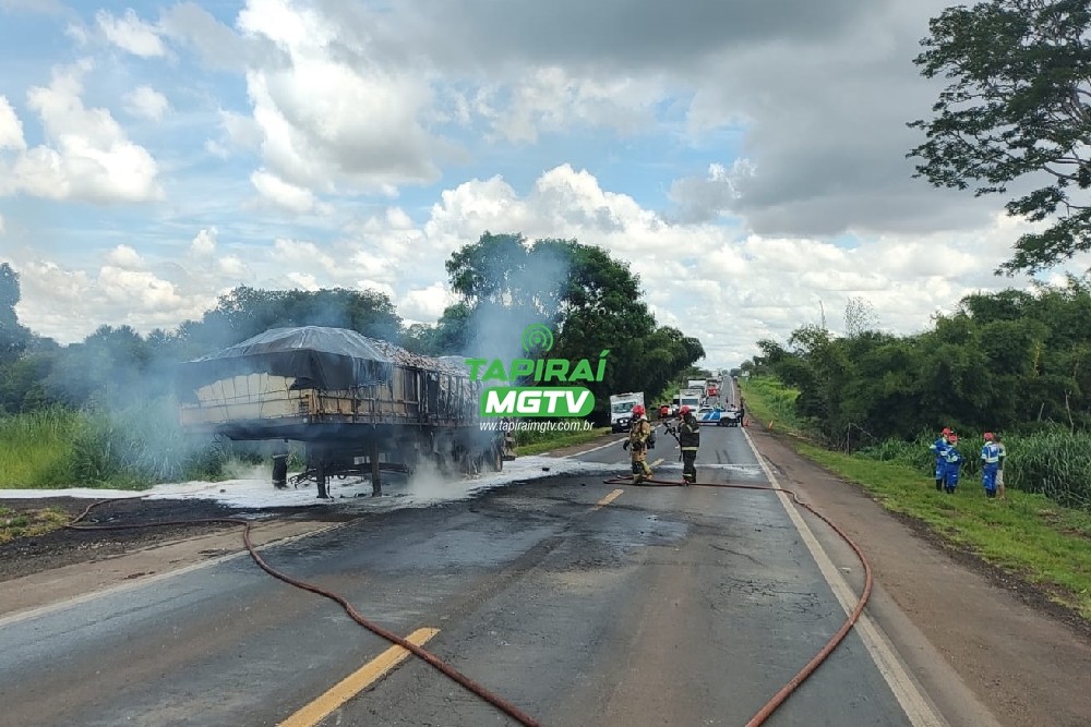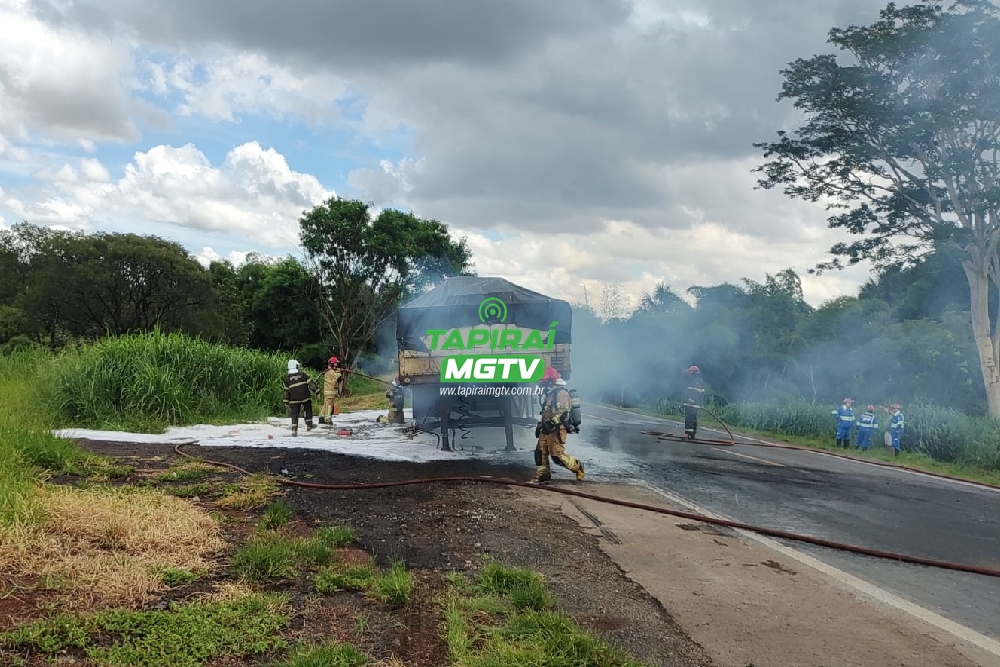Uma carreta carregada com açúcar pegou fogo, nesta quinta-feira (19/02), na BR-262, em Uberaba. O Corpo de Bombeiros apagou às chamas no local, e ninguém se feriu.