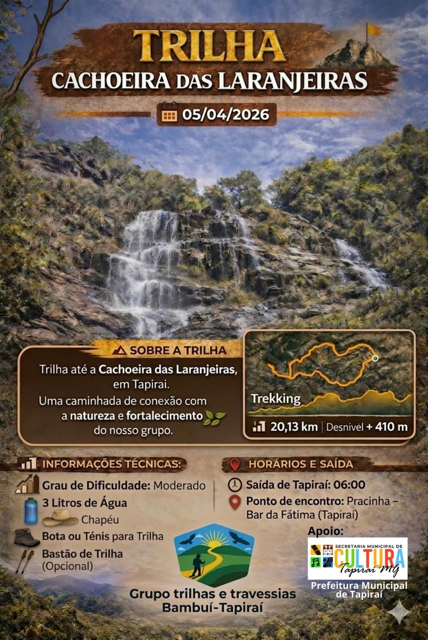 O Grupo Trilhas e Travessias Bambuí/Tapiraí realiza, no próximo domingo (05/04), mais uma aventura para os amantes da natureza e do ecoturismo. Desta vez, o destino será a encantadora Cachoeira das Laranjeiras, localizada no município de Tapiraí.