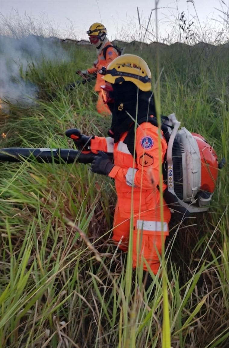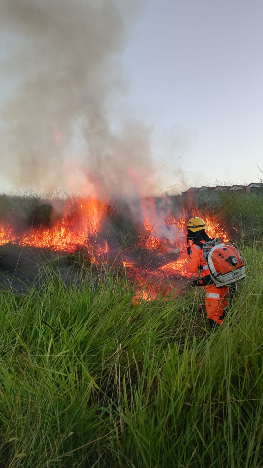 Segundo o Corpo de Bombeiros, o fogo atingiu uma área de cerrado, com vários focos espalhados. Diante disso, a equipe iniciou o combate direto às chamas, utilizando equipamentos como abafadores e sopradores.