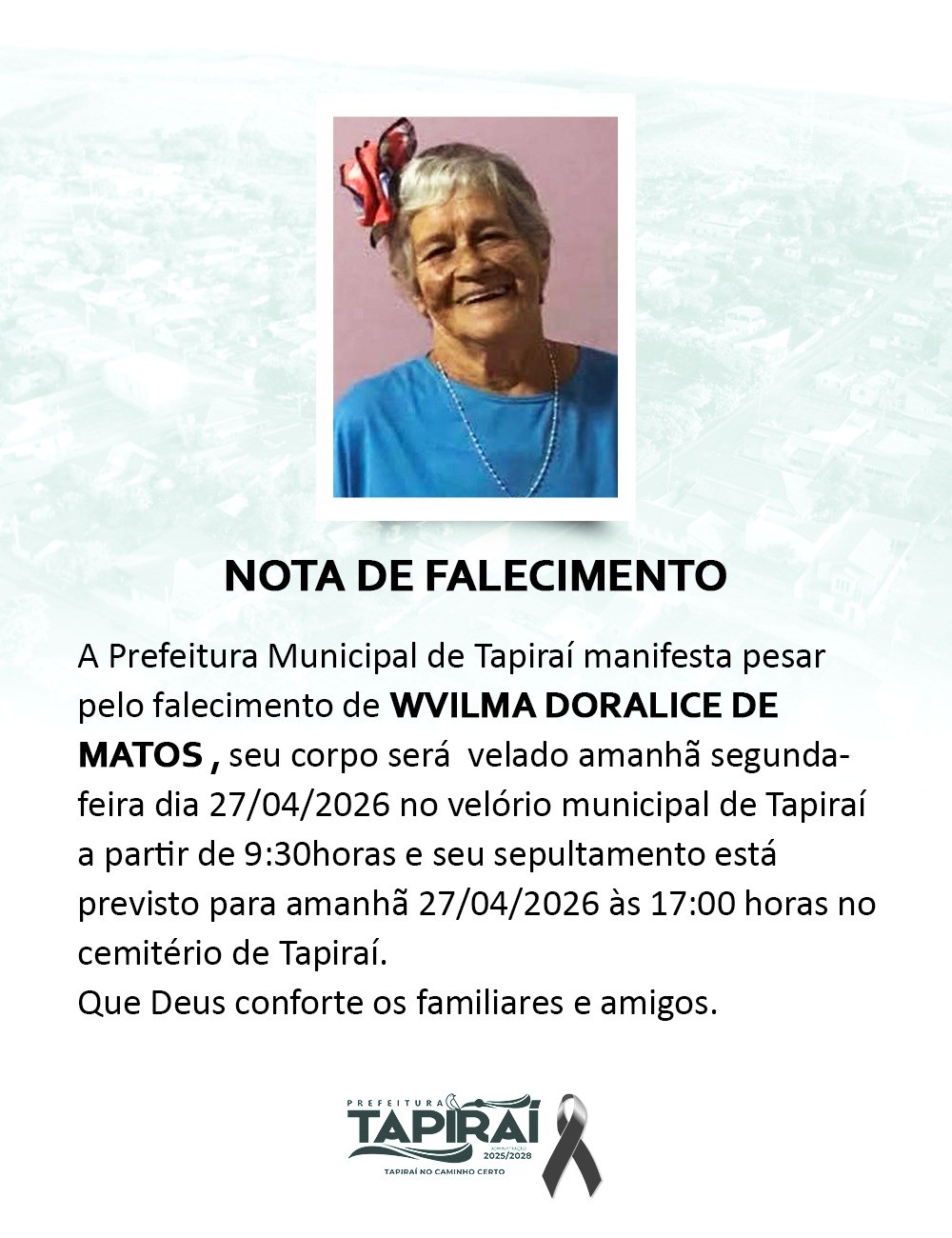 A Prefeitura Municipal de Tapiraí e o Tapiraímg TV se solidarizam com familiares e amigos de Wvilma Doralice de Matos.