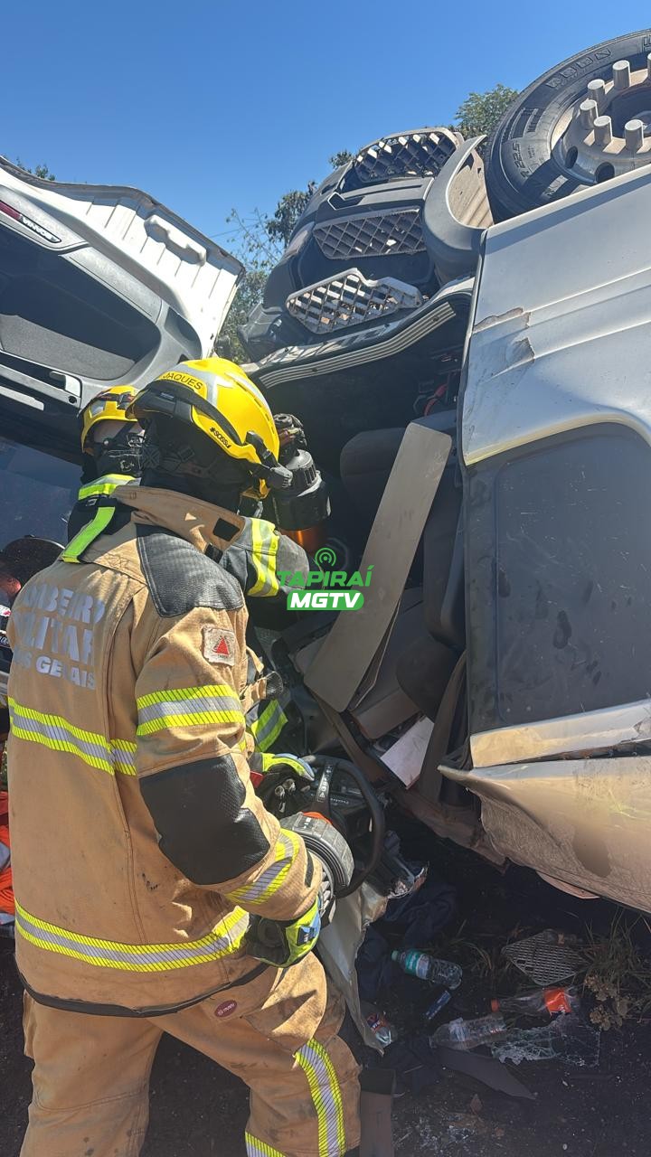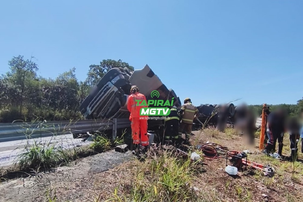 De acordo com o Corpo de Bombeiros, uma carreta carregada com minério perdeu o controle e acabou tombando. Com o impacto, a cabine ficou virada para baixo, apoiada diretamente no guard rail da pista, deixando o condutor preso na estrutura deformada.