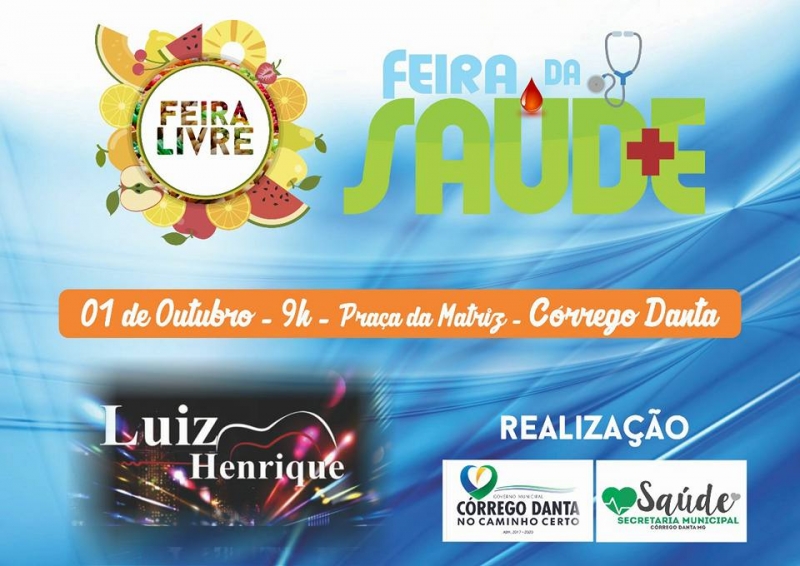 A prefeitura de Córrego Danta através da Secretaria de Saúde do município, realiza no dia 01/10, domingo, a Feira da Saúde, a partir das 9h, na Pça da Matriz. O evento será gratuito.